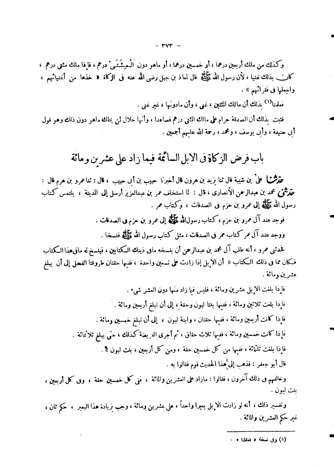 7364 - حَدَّثَنَا عَلِيُّ بْنُ شَيْبَةَ، قَالَ ثنا يَزِيدُ بْنُ هَارُونَ، قَالَ أَخْبَرَنَا حَبِيبُ بْنُ أَبِي حَبِيبٍ، قَالَ: ثنا عَمْرُو بْنُ هَرِمٍ، قَالَ: حَدَّثَنِي مُحَمَّدُ بْنُ عَبْدِ الرَّحْمَنِ الْأَنْصَارِيُّ، قَالَ: لَمَّا اسْتُخْلِفَ عُمَرُ بْنُ عَبْدِ الْعَزِيزِ أَرْسَلَ إِلَى الْمَدِينَةِ , يَلْتَمِسُ كِتَابَ رَسُولِ اللهِ صَلَّى اللَّهُ عَلَيْهِ وَسَلَّمَ إِلَى عَمْرِو بْنِ حَزْمٍ فِي الصَّدَقَاتِ , وَكِتَابَ عُمَرَ. فَوَجَدَ عِنْدَ آلِ عَمْرِو بْنِ حَزْمٍ , كِتَابَ رَسُولِ اللهِ صَلَّى اللَّهُ عَلَيْهِ وَسَلَّمَ إِلَى عَمْرِو بْنِ حَزْمٍ فِي الصَّدَقَاتِ. وَوَجَدَ عِنْدَ آلِ عُمَرَ كِتَابَ عُمَرَ فِي الصَّدَقَاتِ , مِثْلَ كِتَابِ رَسُولِ اللهِ صَلَّى اللَّهُ عَلَيْهِ وَسَلَّمَ فَنُسِخَا. فَحَدَّثَنِي عَمْرٌو , أَنَّهُ طَلَبَ آلُ مُحَمَّدِ بْنِ عَبْدِ الرَّحْمَنِ أَنْ يَنْسَخَهُ مَا فِي ذَيْنِكَ الْكِتَابَيْنِ , فَيَنْسَخَ لَهُ مَا فِي هَذَا الْكِتَابِ فَكَانَ مِمَّا فِي ذَلِكَ الْكِتَابِ «أَنَّ §الْإِبِلَ إِذَا زَادَتْ عَلَى تِسْعِينَ وَاحِدَةً , فَفِيهَا حِقَّتَانِ طَرُوقَتَا الْفَحْلِ إِلَى أَنْ يَبْلُغَ عِشْرِينَ وَمِائَةً. فَإِذَا بَلَغَتِ الْإِبِلُ عِشْرِينَ وَمِائَةً , فَلَيْسَ فِيمَا زَادَ مِنْهَا دُونَ الْعَشْرِ شَيْءٌ. فَإِذَا بَلَغَتْ ثَلَاثِينَ وَمِائَةً , فَفِيهَا بِنْتَا لَبُونٍ وَحِقَّةٌ , إِلَى أَنْ تَبْلُغَ أَرْبَعِينَ وَمِائَةً. فَإِذَا كَانَتْ أَرْبَعِينَ وَمِائَةً , فَفِيهَا حِقَّتَانِ , وَابْنَةُ لَبُونٍ , إِلَى أَنْ تَبْلُغَ خَمْسِينَ وَمِائَةً. فَإِذَا كَانَتْ خَمْسِينَ وَمِائَةً , فَفِيهَا ثَلَاثُ حِقَاقٍ , ثُمَّ أَجْرَى الْفَرِيضَةَ كَذَلِكَ , حَتَّى يَبْلُغَ ثَلَاثَمِائَةٍ. فَإِذَا بَلَغَتْ ثَلَثَمِائَةٍ , فَفِيهَا مِنْ كُلِّ خَمْسِينَ حِقَّةٌ , وَمِنْ كُلِّ أَرْبَعِينَ , بِنْتُ لَبُونٍ» قَالَ أَبُو جَعْفَرٍ: فَذَهَبَ إِلَى هَذَا الْحَدِيثِ قَوْمٌ فَقَالُوا بِهِ. وَخَالَفَهُمْ فِي ذَلِكَ آخَرُونَ , فَقَالُوا: مَا زَادَ عَلَى الْعِشْرِينَ وَالْمِائَةِ , فَفِي كُلِّ خَمْسِينَ حِقَّةٌ , وَفِي كُلِّ أَرْبَعِينَ , بِنْتُ لَبُونٍ. وَتَفْسِيرُ ذَلِكَ , أَنَّهُ لَوْ زَادَتِ الْإِبِلُ بَعِيرًا وَاحِدًا , عَلَى عِشْرِينَ وَمِائَةٍ , وَجَبَ بِزِيَادَةِ هَذَا الْبَعِيرِ حُكْمٌ ثَانٍ , غَيْرُ حُكْمِ الْعِشْرِينَ وَالْمِائَةِ. -[374]- فَوَجَبَ فِي كُلِّ أَرْبَعِينَ بِنْتُ لَبُونٍ ثُمَّ يُجْرُونَ ذَلِكَ كَذَلِكَ , حَتَّى تَبْلُغَ الزِّيَادَةُ تَمَامَ الْمِائَةِ وَالثَّلَاثِينَ , فَيَجْعَلُونَ فِيهَا حِقَّةً وَبِنْتَيْ لَبُونٍ. ثُمَّ يَكُونُ ذَلِكَ كَذَلِكَ , حَتَّى يَتَنَاهَى الزِّيَادَةُ إِلَى أَرْبَعِينَ وَمِائَةٍ , فَإِذَا كَانَتْ أَرْبَعِينَ وَمِائَةً , كَانَ فِيهَا حِقَّتَانِ , وَبِنْتُ لَبُونٍ , إِلَى خَمْسِينَ وَمِائَةٍ. فَإِذَا كَانَتْ خَمْسِينَ وَمِائَةً , كَانَ فِيهَا ثَلَاثُ حِقَاقٍ , ثُمَّ يُجْرُونَ الْفَرْضَ فِي الزِّيَادَةِ عَلَى ذَلِكَ كَذَلِكَ , أَبَدًا. وَاحْتَجُّوا فِي ذَلِكَ مِنَ الْآثَارِ