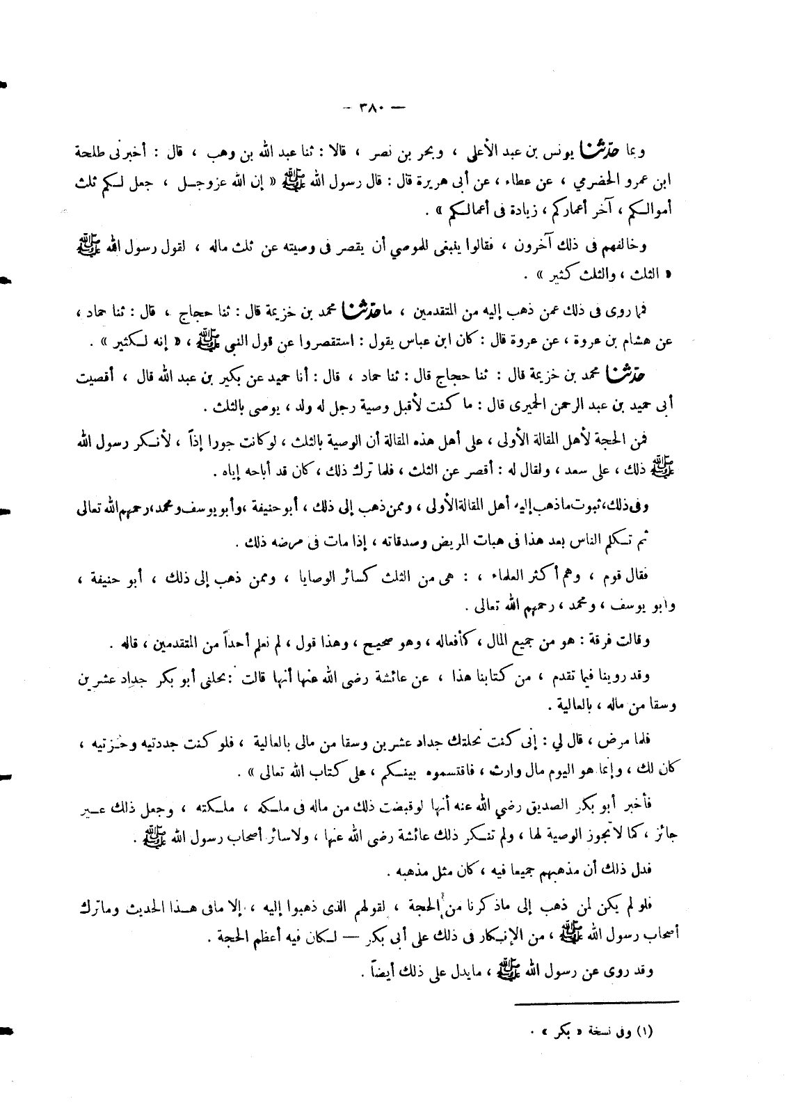 7382 - حَدَّثَنَا مُحَمَّدُ بْنُ خُزَيْمَةَ، قَالَ: ثنا حَجَّاجٌ، قَالَ: ثنا حَمَّادٌ، قَالَ: أنا حُمَيْدٌ، عَنْ بَكْرِ بْنِ عَبْدِ اللهِ قَالَ: أَوْصَيْتُ إِلَى حُمَيْدِ بْنِ عَبْدِ الرَّحْمَنِ الْحِمْيَرِيِّ قَالَ: «§مَا كُنْتُ لِأَقْبَلَ وَصِيَّةَ رَجُلٍ لَهُ وَلَدٌ يُوصِي بِالثُّلُثِ» فَمِنَ الْحُجَّةِ لِأَهْلِ الْمَقَالَةِ الْأُولَى , عَلَى أَهْلِ هَذِهِ الْمَقَالَةِ أَنَّ الْوَصِيَّةَ بِالثُّلُثِ , لَوْ كَانَتْ جَوْرًا إِذًا , لَأَنْكَرَ رَسُولُ اللهِ صَلَّى اللَّهُ عَلَيْهِ وَسَلَّمَ ذَلِكَ , عَلَى سَعْدٍ , وَلَقَالَ لَهُ: أَقْصِرْ عَنِ الثُّلُثِ , فَلَمَّا تَرَكَ ذَلِكَ , كَانَ قَدْ أَبَاحَهُ إِيَّاهُ. وَفِي ذَلِكَ ثُبُوتُ مَا ذَهَبَ إِلَيْهِ أَهْلُ الْمَقَالَةِ الْأُولَى , وَمِمَّنْ ذَهَبَ إِلَى ذَلِكَ , أَبُو حَنِيفَةَ , وَأَبُو يُوسُفَ وَمُحَمَّدٌ , رَحِمَهُمُ اللهُ تَعَالَى. ثُمَّ تَكَلَّمَ النَّاسُ بَعْدَ هَذَا فِي هِبَاتِ الْمَرِيضِ وَصَدَقَاتِهِ , إِذَا مَاتَ فِي مَرَضِهِ ذَلِكَ. فَقَالَ قَوْمٌ , وَهُمْ أَكْثَرُ الْعُلَمَاءِ: هِيَ مِنَ الثُّلُثِ كَسَائِرِ الْوَصَايَا , وَمِمَّنْ ذَهَبَ إِلَى ذَلِكَ , أَبُو حَنِيفَةَ , وَأَبُو يُوسُفَ , وَمُحَمَّدٌ , رَحِمَهُمُ اللهُ تَعَالَى. وَقَالَتْ فِرْقَةٌ: هُوَ مِنْ جَمِيعِ الْمَالِ , كَأَفْعَالِهِ , وَهُوَ صَحِيحٌ , وَهَذَا قَوْلٌ , لَمْ نَعْلَمْ أَحَدًا مِنَ الْمُتَقَدِّمِينَ , قَالَهُ. وَقَدْ رَوَيْنَا فِيمَا تَقَدَّمَ , مِنْ كِتَابِنَا هَذَا , عَنْ عَائِشَةَ رَضِيَ اللهُ عَنْهَا أَنَّهَا قَالَتْ: " نَحَلَنِي أَبُو بَكْرٍ جِدَادَ عِشْرِينَ وَسْقًا مِنْ مَالِهِ , بِالْعَالِيَةِ. فَلَمَّا مَرِضَ , قَالَ لِي: إِنِّي كُنْتُ نَحَلْتُكَ جِدَادَ عِشْرِينَ وَسْقًا مِنْ مَالِي بِالْعَالِيَةِ , فَلَوْ كُنْتِ جَدَدْتِيهِ وَحُزْتِيهِ , كَانَ لَكَ , وَإِنَّمَا هُوَ الْيَوْمَ مَالُ وَارِثٍ , فَاقْتَسِمُوهُ بَيْنَكُمْ , عَلَى كِتَابِ اللهِ تَعَالَى. فَأَخْبَرَ أَبُو بَكْرٍ الصِّدِّيقُ رَضِيَ اللهُ عَنْهُ أَنَّهَا لَوْ قَبَضَتْ ذَلِكَ فِي الصِّحَّةِ تَمَّ لَهَا مِلْكُهُ وَأَنَّهَا لَا تَسْتَطِيعُ قَبْضَهُ فِي الْمَرَضِ قَبْضًا تَتِمُّ لَهَا بِهِ مِلْكُهُ , وَجَعَلَ ذَلِكَ غَيْرَ جَائِزٍ , كَمَا لَا تَجُوزُ الْوَصِيَّةُ لَهَا , وَلَمْ تُنْكِرْ ذَلِكَ عَائِشَةُ رَضِيَ اللهُ عَنْهَا , وَلَا سَائِرُ أَصْحَابِ رَسُولِ اللهِ صَلَّى اللَّهُ عَلَيْهِ وَسَلَّمَ. فَدَلَّ ذَلِكَ أَنَّ مَذْهَبَهُمْ جَمِيعًا فِيهِ , كَانَ مِثْلَ مَذْهَبِهِ. فَلَوْ لَمْ يَكُنْ لِمَنْ ذَهَبَ إِلَى مَا ذَكَرْنَا مِنَ الْحُجَّةِ , لِقَوْلِهِمِ الَّذِي ذَهَبُوا إِلَيْهِ , إِلَّا مَا فِي هَذَا الْحَدِيثِ وَمَا تَرْكِ أَصْحَابِ رَسُولِ اللهِ صَلَّى اللَّهُ عَلَيْهِ وَسَلَّمَ مِنَ الْإِنْكَارِ فِي ذَلِكَ عَلَى أَبِي بَكْرٍ لَكَانَ فِيهِ أَعْظَمُ الْحُجَّةِ. وَقَدْ رُوِيَ عَنْ رَسُولِ اللهِ صَلَّى اللَّهُ عَلَيْهِ وَسَلَّمَ مَا يَدُلُّ عَلَى ذَلِكَ أَيْضًا
