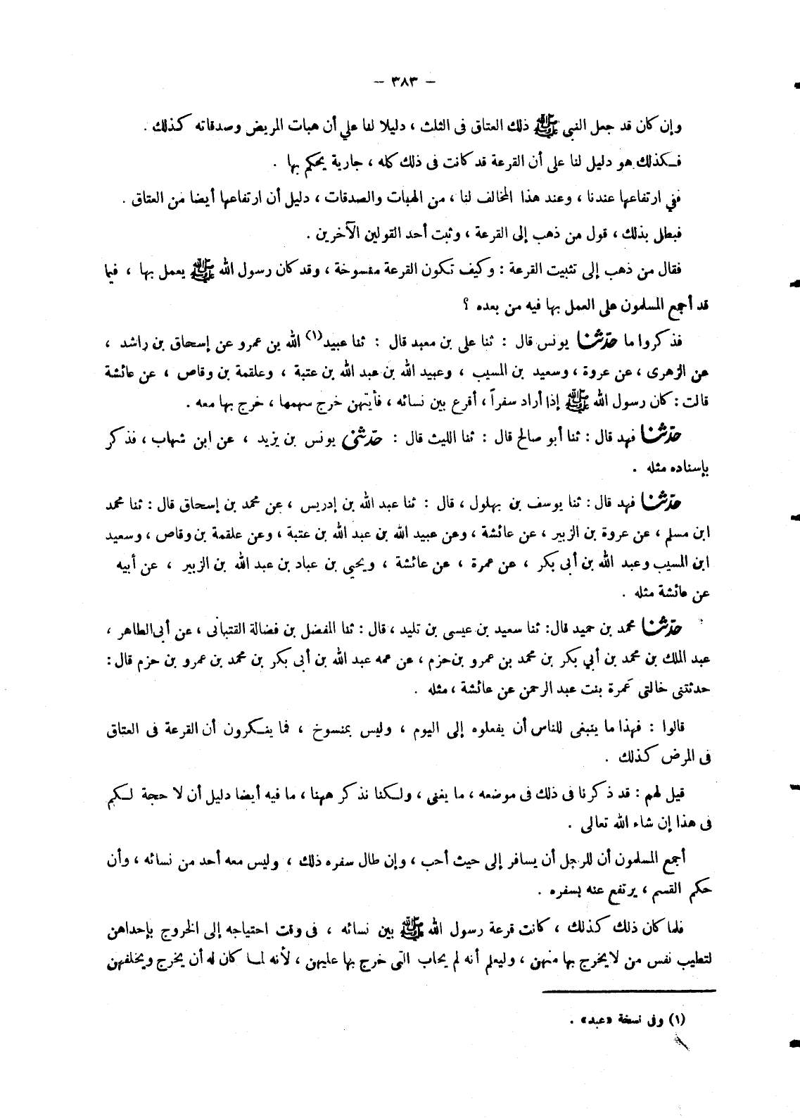 7391 - حَدَّثَنَا مُحَمَّدُ بْنُ حُمَيْدٍ، قَالَ: ثنا سَعِيدُ بْنُ عِيسَى بْنِ تَلِيدٍ، قَالَ: ثنا الْمُفَضَّلُ بْنُ فَضَالَةَ الْقِتْبَانِيُّ، عَنْ أَبِي الطَّاهِرِ عَبْدِ الْمَلِكِ بْنِ مُحَمَّدِ بْنِ أَبِي بَكْرِ بْنِ مُحَمَّدِ بْنِ عَمْرِو بْنِ حَزْمٍ , عَنْ عَمِّهِ عَبْدِ اللهِ بْنِ أَبِي بَكْرِ بْنِ مُحَمَّدِ بْنِ عَمْرِو بْنِ حَزْمٍ، قَالَ: حَدَّثَتْنِي خَالَتِي، عَمْرَةُ بِنْتُ عَبْدِ الرَّحْمَنِ عَنْ عَائِشَةَ، مِثْلَهُ قَالُوا: فَهَذَا مَا يَنْبَغِي لِلنَّاسِ أَنْ يَفْعَلُوهُ إِلَى الْيَوْمِ , وَلَيْسَ بِمَنْسُوخٍ , فَمَا يُنْكِرُونَ أَنَّ الْقُرْعَةَ فِي الْعَتَاقِ فِي الْمَرَضِ كَذَلِكَ. قِيلَ لَهُمْ: قَدْ ذَكَرْنَا فِي ذَلِكَ فِي مَوْضِعِهِ , مَا يُغْنِي , وَلَكِنَّا نَذْكُرُ هَاهُنَا , مَا فِيهِ أَيْضًا دَلِيلُ أَنْ لَا حُجَّةَ لَكُمْ فِي هَذَا إِنْ شَاءَ اللهُ تَعَالَى. أَجْمَعَ الْمُسْلِمُونَ أَنَّ لِلرَّجُلِ أَنْ يُسَافِرَ إِلَى حَيْثُ أَحَبَّ , وَإِنْ طَالَ سَفَرُهُ ذَلِكَ , وَلَيْسَ مَعَهُ أَحَدٌ مِنْ نِسَائِهِ , وَأَنَّ حُكْمَ الْقَسْمِ , يَرْتَفِعُ عَنْهُ بِسَفَرِهِ. فَلَمَّا كَانَ ذَلِكَ كَذَلِكَ , كَانَتْ قُرْعَةُ رَسُولِ اللهِ صَلَّى اللَّهُ عَلَيْهِ وَسَلَّمَ بَيْنَ نِسَائِهِ , فِي وَقْتِ احْتِيَاجِهِ إِلَى الْخُرُوجِ بِإِحْدَاهُنَّ لِتَطِيبَ نَفْسُ مَنْ لَا يَخْرُجُ بِهَا مِنْهُنَّ , وَلِيُعْلَمَ أَنَّهُ لَمْ يُحَابِ الَّتِي خَرَجَ بِهَا عَلَيْهِنَّ , لِأَنَّهُ لَمَّا كَانَ لَهُ أَنْ يَخْرُجَ وَيُخَلِّفَهُنَّ -[384]- جَمِيعًا , كَانَ لَهُ أَنْ يَخْرُجَ وَيُخَلِّفَ مَنْ شَاءَ مِنْهُنَّ. فَثَبَتَ بِمَا ذَكَرْنَا أَنَّ الْقُرْعَةَ إِنَّمَا تُسْتَعْمَلُ فِيمَا يَسَعُ تَرْكَهَا , وَفِيمَا لَهُ أَنْ يُمْضِيَهُ بِغَيْرِهَا. وَمِنْ ذَلِكَ , الْخَصْمَانِ يَحْضُرَانِ عِنْدَ الْحَاكِمِ , فَيَدَّعِي كُلُّ وَاحِدٍ مِنْهُمَا عَلَى صَاحِبِهِ دَعْوَى. فَيَنْبَغِي لِلْقَاضِي أَنْ يُقْرِعَ بَيْنَهُمَا , فَأَيُّهُمَا أُقْرِعَ , بَدَأَ بِالنَّظَرِ فِي أَمْرِهِ , وَلَهُ أَنْ يَنْظُرَ فِي أَمْرِ مَنْ شَاءَ مِنْهُمَا بِغَيْرِ قُرْعَةٍ. فَكَانَ الْأَحْسَنُ بِهِ ; لِبُعْدِ الظَّنِّ بِهِ فِي هَذَا اسْتِعْمَالَ الْقُرْعَةِ , كَمَا اسْتَعْمَلَهَا رَسُولُ اللهِ صَلَّى اللَّهُ عَلَيْهِ وَسَلَّمَ فِي أَمْرِ نِسَائِهِ. وَكَذَلِكَ عَمِلَ الْمُسْلِمُونَ فِي أَقْسَامِهِمْ بِالْقُرْعَةِ , فِيمَا قَدْ عَدَلُوهُ بَيْنَ أَهْلِهِمْ , بِمَا لَوْ أَمْضَوْهُ بَيْنَهُمْ , لَا عَنْ قُرْعَةٍ , كَانَ ذَلِكَ مُسْتَقِيمًا. فَأَقْرَعُوا بَيْنَهُمْ ; لِتَطْمَئِنَّ قُلُوبُهُمْ , وَتَرْتَفِعَ الظِّنَّةُ , عَمَّنْ تَوَلَّى لَهُمْ قِسْمَتَهُمْ. وَلَوْ أَقْرَعَ بَيْنَهُمْ , عَلَى طَوَائِفَ مِنَ الْمَتَاعِ , الَّذِي لَهُمْ , قَبْلَ أَنْ يُعَدِّلَ وَيُسَوِّيَ قِيمَتَهُ عَلَى أَمْلَاكِهِمْ مِنْهُ , كَانَ ذَلِكَ الْقَسْمُ بَاطِلًا. فَثَبَتَ بِذَلِكَ أَنَّ الْقُرْعَةَ إِنَّمَا فُعِلَتْ , بَعْدَ أَنْ تَقَدَّمَهَا , مَا يَجُوزُ الْقَسْمُ بِهِ , وَأَنَّهَا إِنَّمَا أُرِيدَتْ لِانْتِفَاءِ الظَّنِّ , لَا بِحُكْمٍ يَجِبُ بِهَا. فَكَذَلِكَ نَقُولُ كُلُّ قُرْعَةٍ تَكُونُ مِثْلَ هَذَا , فَهِيَ حَسَنَةٌ , وَكُلُّ قُرْعَةٍ يُرَادُ بِهَا وُجُوبُ حُكْمٍ , وَقَطْعُ حُقُوقٍ مُتَقَدِّمَةٍ , فَهِيَ غَيْرُ مُسْتَعْمَلَةٍ. ثُمَّ رَجَعْنَا إِلَى الْقَوْلَيْنِ الْآخَرَيْنِ , فَرَأَيْنَا رَسُولَ اللهِ صَلَّى اللَّهُ عَلَيْهِ وَسَلَّمَ قَدْ حَكَمَ فِي الْعَبْدِ , إِذَا كَانَ بَيْنَ اثْنَيْنِ , فَأَعْتَقَهُ أَحَدُهُمَا , فَإِنَّهُ حُرٌّ كُلُّهُ , وَيَضْمَنُ إِنْ كَانَ مُوسِرًا , أَوْ إِنْ كَانَ مُعْسِرًا. فَفِي ذَلِكَ مِنَ الِاخْتِلَافِ , مَا ذَكَرْنَاهُ ف