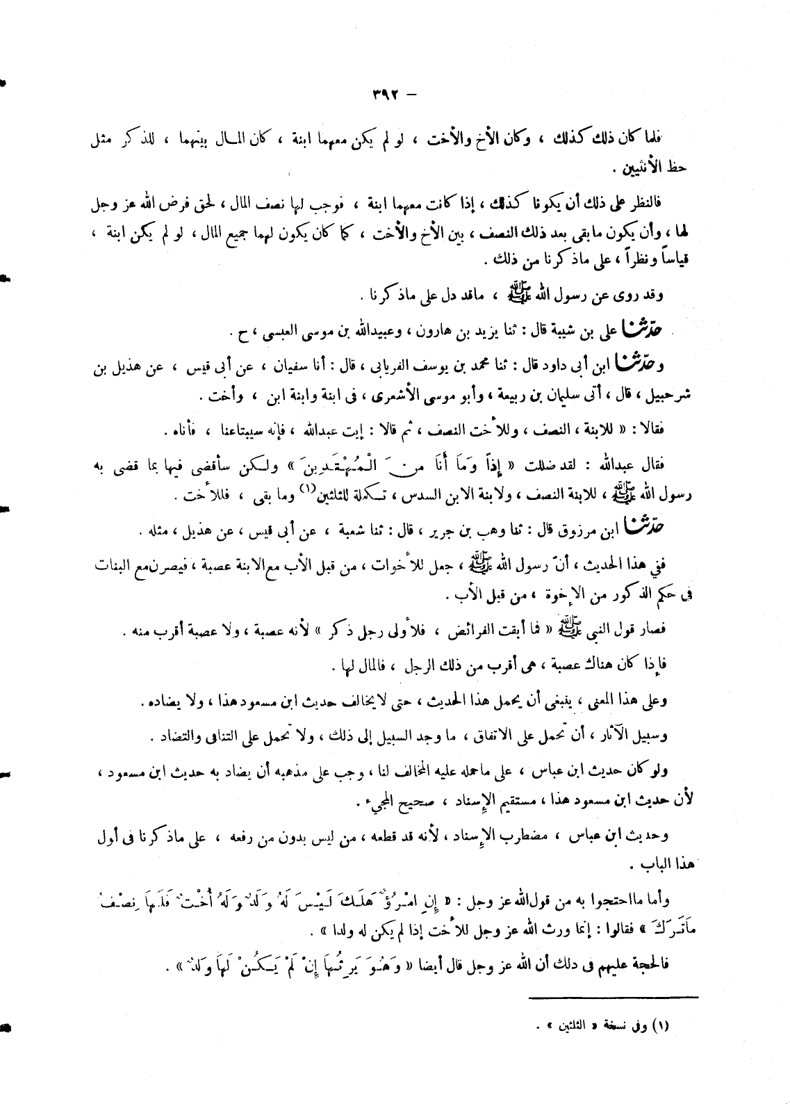 7410 - حَدَّثَنَا ابْنُ مَرْزُوقٍ، قَالَ: ثنا وَهْبُ بْنُ جَرِيرٍ، قَالَ: ثنا شُعْبَةٌ، عَنْ أَبِي قَيْسٍ، عَنْ هُذَيْلٍ، مِثْلَهُ فَفِي هَذَا الْحَدِيثِ , أَنَّ رَسُولَ اللهِ صَلَّى اللَّهُ عَلَيْهِ وَسَلَّمَ جَعَلَ لِلْأَخَوَاتِ , مِنْ قِبَلِ الْأَبِ مَعَ الِابْنَةِ عَصَبَةً , فَيَصِرْنَ مَعَ الْبَنَاتِ فِي حُكْمِ الذُّكُورِ مِنَ الْإِخْوَةِ , مِنْ قِبَلِ الْأَبِ. فَصَارَ قَوْلُ النَّبِيِّ صَلَّى اللَّهُ عَلَيْهِ وَسَلَّمَ فَمَا أَبْقَتِ الْفَرَائِضُ , فَلِأَوْلَى رَجُلٍ ذَكَرٍ؛ لِأَنَّهُ عَصَبَةٌ , وَلَا عَصَبَةَ أَقْرَبُ مِنْهُ. فَإِذَا كَانَ هُنَاكَ عَصَبَةٌ هِيَ أَقْرَبُ مِنْ ذَلِكَ الرَّجُلِ , فَالْمَالُ لَهَا. وَعَلَى هَذَا الْمَعْنَى , يَنْبَغِي أَنْ يُحْمَلَ هَذَا الْحَدِيثُ , حَتَّى لَا يُخَالِفَ حَدِيثَ ابْنِ مَسْعُودٍ هَذَا , وَلَا يُضَادَّهُ. وَسَبِيلُ الْآثَارِ أَنْ تُحْمَلَ عَلَى الِاتِّفَاقِ مَا وُجِدَ السَّبِيلُ إِلَى ذَلِكَ , وَلَا تُحْمَلُ عَلَى التَّنَافِي وَالتَّضَادِّ. وَلَوْ كَانَ حَدِيثُ ابْنِ عَبَّاسٍ عَلَى مَا حَمَلَهُ عَلَيْهِ الْمُخَالِفُ لَنَا وَجَبَ عَلَى مَذْهَبِهِ أَنْ يُضَادَّ بِهِ حَدِيثَ ابْنِ مَسْعُودٍ؛ لِأَنَّ حَدِيثَ ابْنِ مَسْعُودٍ هَذَا , مُسْتَقِيمُ الْإِسْنَادِ , صَحِيحُ الْمَجِيءِ. وَحَدِيثُ ابْنِ عَبَّاسٍ , مُضْطَرِبُ الْإِسْنَادِ ; لِأَنَّهُ قَدْ قَطَعَهُ , مَنْ لَيْسَ بِدُونِ مَنْ رَفَعَهُ , عَلَى مَا ذَكَرْنَا فِي أَوَّلِ هَذَا الْبَابِ. وَأَمَّا مَا احْتَجُّوا بِهِ مِنْ قَوْلِ اللهِ عَزَّ وَجَلَّ: {إِنِ امْرُؤٌ هَلَكَ لَيْسَ لَهُ وَلَدٌ وَلَهُ أُخْتٌ فَلَهَا نِصْفُ مَا تَرَكَ} [النساء: 176] فَقَالُوا: إِنَّمَا وَرَّثَ اللهُ عَزَّ وَجَلَّ الْأُخْتَ إِذَا لَمْ يَكُنْ لَهُ وَلَدٌ. فَالْحُجَّةُ عَلَيْهِمْ فِي ذَلِكَ أَنَّ اللهَ عَزَّ وَجَلَّ قَالَ أَيْضًا {وَهُوَ يَرِثُهَا إِنْ لَمْ يَكُنْ لَهَا وَلَدٌ} [النساء: 176] . -[393]- وَقَدْ أَجْمَعُوا جَمِيعًا , عَلَى أَنَّهَا لَوْ تَرَكَتْ بِنْتَهَا وَأَخَاهَا لِأَبِيهَا , كَانَ لِلِابْنَةِ النِّصْفُ , وَمَا بَقِيَ فَلِلْأَخِ. وَأَنَّ مَعْنَى قَوْلِ اللهِ عَزَّ وَجَلَّ {إِنْ لَمْ يَكُنْ لَهَا وَلَدٌ} [النساء: 176] إِنَّمَا هُوَ عَلَى وَلَدٍ , يَحُوزُ كُلَّ الْمِيرَاثِ , لَا عَلَى الْوَلَدِ الَّذِي لَا يَحُوزُ كُلَّ الْمِيرَاثِ. فَالنَّظَرُ عَلَى ذَلِكَ , أَيْضًا , أَنْ يَكُونَ قَوْلُهُ عَزَّ وَجَلَّ {إِنِ امْرُؤٌ هَلَكَ لَيْسَ لَهُ وَلَدٌ وَلَهُ أُخْتٌ فَلَهَا نِصْفُ مَا تَرَكَ} [النساء: 176] هُوَ عَلَى وَلَدٍ يَحُوزُ جَمِيعَ الْمِيرَاثِ , لَا عَلَى وَلَدٍ لَا يَحُوزُ جَمِيعَ الْمِيرَاثِ. فَأَمَّا مَا احْتَجُّوا بِهِ مِنْ مَذْهَبِ ابْنِ عَبَّاسٍ فِي ذَلِكَ , فَإِنَّهُ خَالَفَ فِيهِ سَائِرَ أَصْحَابِ رَسُولِ اللهِ صَلَّى اللَّهُ عَلَيْهِ وَسَلَّمَ سِوَاهُ. فَمِمَّا رُوِيَ عَنْهُمْ فِي ذَلِكَ