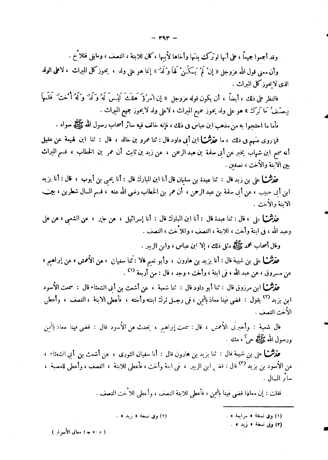 7412 - حَدَّثَنَا عَلِيُّ بْنُ زَيْدٍ، قَالَ: ثنا عَبْدَةُ بْنُ سُلَيْمَانَ، قَالَ أنا ابْنُ الْمُبَارَكِ، قَالَ: أنا يَحْيَى بْنُ أَيُّوبَ، قَالَ: أنا يَزِيدُ بْنُ أَبِي حَبِيبٍ، عَنْ أَبِي سَلَمَةَ بْنِ عَبْدِ الرَّحْمَنِ، «أَنَّ عُمَرَ بْنَ الْخَطَّابِ، رَضِيَ اللهُ عَنْهُ , §قَسَمَ الْمَالَ شَطْرَيْنِ , بَيْنَ الِابْنَةِ وَالْأُخْتِ»