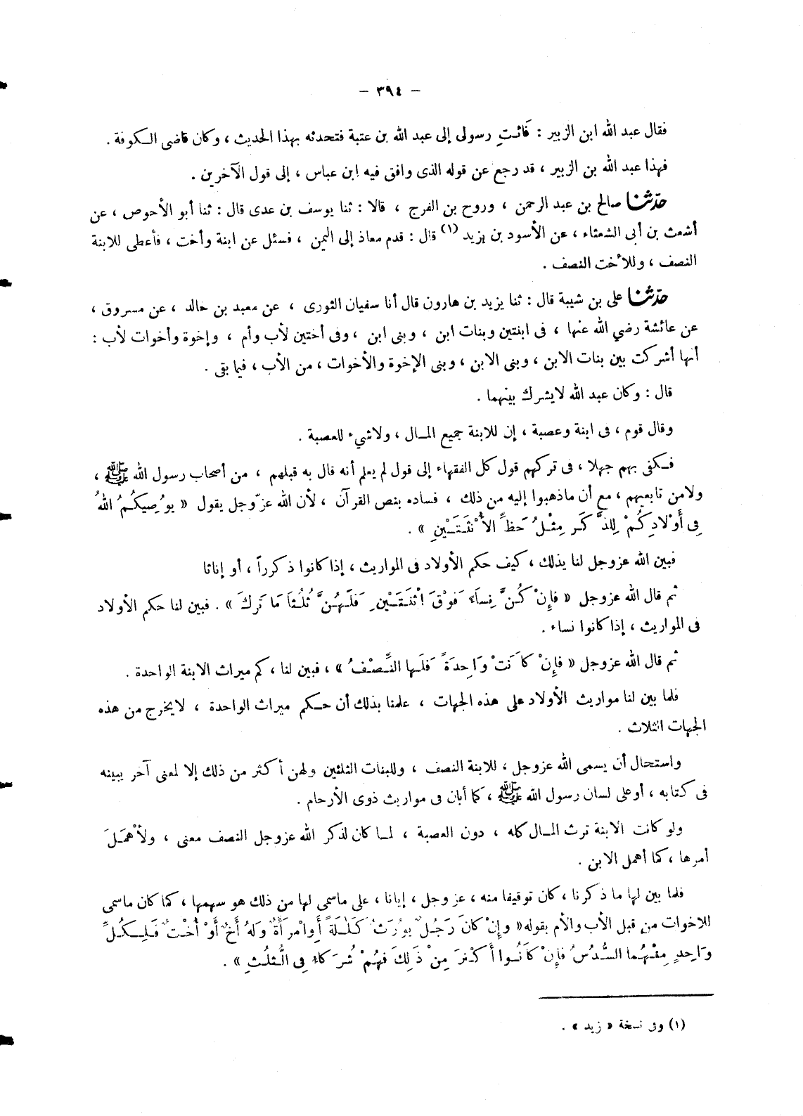 7419 - حَدَّثَنَا عَلِيُّ بْنُ شَيْبَةَ، قَالَ: ثنا يَزِيدُ بْنُ هَارُونَ، قَالَ أنا سُفْيَانُ الثَّوْرِيُّ، عَنْ مَعْبَدِ بْنِ خَالِدٍ، عَنْ مَسْرُوقٍ، عَنْ عَائِشَةَ، رَضِيَ اللهُ عَنْهَا , فِي ابْنَتَيْنِ وَبَنَاتِ ابْنٍ , وَبَنِي ابْنٍ , وَفِي أُخْتَيْنِ لِأَبٍ وَأُمٍّ , وَإِخْوَةٍ وَأَخَوَاتٍ لِأَبٍ " أَنَّهَا §أَشْرَكَتْ بَيْنَ بَنَاتِ الِابْنِ , وَبَنِي الِابْنِ , وَبَنِي الْإِخْوَةِ وَالْأَخَوَاتِ , مِنَ الْأَبِ , فِيمَا بَقِيَ. قَالَ: وَكَانَ عَبْدُ اللهِ لَا يُشْرِكُ بَيْنَهُمَا " وَقَالَ قَوْمٌ , فِي ابْنَةٍ وَعَصَبَةٍ , إِنَّ لِلِابْنَةِ جَمِيعَ الْمَالِ , وَلَا شَيْءَ لِلْعَصَبَةِ. فَكَفَى بِهِمْ جَهْلًا , فِي تَرْكِهِمْ قَوْلَ كُلِّ الْفُقَهَاءِ إِلَى قَوْلٍ لَمْ يُعْلَمْ أَنَّهُ قَالَ بِهِ قَبْلَهُمْ , مِنْ أَصْحَابِ رَسُولِ اللهِ صَلَّى اللَّهُ عَلَيْهِ وَسَلَّمَ وَلَا مِنْ تَابِعِيهِمْ , مَعَ أَنَّ مَا ذَهَبُوا إِلَيْهِ مِنْ ذَلِكَ , فَسَادُهُ بِنَصِّ الْقُرْآنِ ; لِأَنَّ اللهَ عَزَّ وَجَلَّ يَقُولُ {يُوصِيكُمُ اللهُ فِي أَوْلَادِكُمْ لِلذَّكَرِ مِثْلُ حَظِّ الْأُنْثَيَيْنِ} [النساء: 11] . فَبَيَّنَ اللهُ عَزَّ وَجَلَّ لَنَا بِذَلِكَ , كَيْفَ حُكْمُ الْأَوْلَادِ فِي الْمَوَارِيثِ , إِذَا كَانُوا ذُكُورًا , أَوْ إِنَاثًا ثُمَّ قَالَ اللهُ عَزَّ وَجَلَّ {فَإِنْ كُنَّ نِسَاءً فَوْقَ اثْنَتَيْنِ فَلَهُنَّ ثُلُثَا مَا تَرَكَ} [النساء: 11] . فَبَيَّنَ لَنَا حُكْمَ الْأَوْلَادِ فِي الْمَوَارِيثِ , إِذَا كَانُوا نِسَاءً. ثُمَّ قَالَ اللهُ عَزَّ وَجَلَّ {وَإِنْ كَانَتْ وَاحِدَةً فَلَهَا النِّصْفُ} [النساء: 11] , فَبَيَّنَ لَنَا , كَمْ مِيرَاثُ الِابْنَةِ الْوَاحِدَةِ. فَلَمَّا بَيَّنَ لَنَا مَوَارِيثَ الْأَوْلَادِ عَلَى هَذِهِ الْجِهَاتِ , عَلِمْنَا بِذَلِكَ أَنَّ حُكْمَ مِيرَاثِ الْوَاحِدَةِ , لَا يَخْرُجُ مِنْ هَذِهِ الْجِهَاتِ الثَّلَاثِ. وَاسْتَحَالَ أَنْ يُسَمِّيَ اللهُ عَزَّ وَجَلَّ , لِلِابْنَةِ النِّصْفَ , وَلِلْبَنَاتِ الثُّلُثَيْنِ وَلَهُنَّ أَكْثَرُ مِنْ ذَلِكَ إِلَّا لِمَعْنًى آخَرَ يُبَيِّنُهُ فِي كِتَابِهِ , أَوْ عَلَى لِسَانِ رَسُولِ اللهِ صَلَّى اللَّهُ عَلَيْهِ وَسَلَّمَ كَمَا أَبَانَ فِي مَوَارِيثِ ذَوِي الْأَرْحَامِ. وَلَوْ كَانَتِ الِابْنَةُ تَرِثُ الْمَالَ كُلَّهُ , دُونَ الْعَصَبَةِ , لَمَا كَانَ لِذِكْرِ اللهِ عَزَّ وَجَلَّ النِّصْفَ مَعْنًى , وَلَأَهْمَلَ أَمْرَهَا , كَمَا أَهْمَلَ الِابْنَ. فَلَمَّا بَيَّنَ لَهَا مَا ذَكَرْنَا , كَانَ تَوْفِيقًا مِنْهُ , عَزَّ وَجَلَّ , إِيَّانَا , عَلَى مَا سَمَّى لَهَا مِنْ ذَلِكَ هُوَ سَهْمُهَا , كَمَا كَانَ مَا سَمَّى لِلْأَخَوَاتِ مِنْ قِبَلِ الْأَبِ وَالْأُمِّ بِقَوْلِهِ {وَإِنْ كَانَ رَجُلٌ يُورَثُ كَلَالَةً أَوِ امْرَأَةٌ وَلَهُ أَخٌ أَوْ أُخْتٌ فَلِكُلِّ وَاحِدٍ مِنْهُمَا السُّدُسُ فَإِنْ كَانُوا أَكْثَرَ مِنْ ذَلِكَ فَهُمْ شُرَكَاءُ فِي الثُّلُثِ} [النساء: 12] . -[395]- فَكَانَ مَا بَقِيَ , بَعْدَ الَّذِي سُمِّيَ لَهُنَّ , لِلْعَصَبَاتِ. وَكَذَلِكَ مِمَّا سُمِّيَ لِلزَّوْجِ وَالْمَرْأَةِ , فِيمَا بَقِيَ بَعْدَ الَّذِي سُمِّيَ لَهُمَا لِلْعَصَبَةِ. فَكَذَلِكَ الِابْنَةُ أَيْضًا , مَا بَقِيَ بَعْدَ الَّذِي سُمِّيَ لَهَا لِلْعَصَبَةِ , هَذَا دَلِيلٌ قَائِمٌ صَحِيحٌ فِي هَذِهِ الْآيَةِ. ثُمَّ رَجَعْنَا إِلَى قَوْلِهِ عَزَّ وَجَلَّ {إِنِ امْرُؤٌ هَلَكَ لَيْسَ لَهُ وَلَدٌ وَلَهُ أُخْتٌ} [النساء: 176] فَلَمْ يُبَيِّنْ لَنَا عَزَّ وَجَلَّ هَاهُنَا , مَنْ ذَلِكَ الْوَلَدُ. فَدَلَّنَا مَا تَقَدَّمَ مِنْ قَوْلِهِ , فِي الْآيَةِ الَّتِي وَقَفْنَا فِيهَا , عَلَى أَنْصِبَاءِ الْأَوْلَادِ , أَنَّ ذَلِكَ الْوَلَدَ , هُوَ مَا تَقَدَّمَ , مِنَ الْوَلَدِ الَّذِي سَم