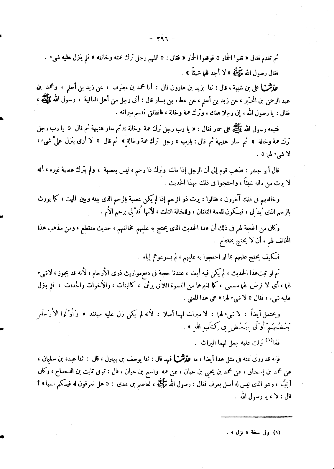 7425 - حَدَّثَنَا عَلِيُّ بْنُ شَيْبَةَ، قَالَ: ثنا يَزِيدُ بْنُ هَارُونَ، قَالَ: أنا مُحَمَّدُ بْنُ مُطَرِّفٍ، عَنْ زَيْدِ بْنِ أَسْلَمَ، وَمُحَمَّدُ بْنُ عَبْدِ الرَّحْمَنِ بْنِ الْمُحَبَّرِ , عَنْ زَيْدِ بْنِ أَسْلَمَ، عَنْ عَطَاءِ بْنِ يَسَارٍ، قَالَ: أَتَى رَجُلٌ مِنْ أَهْلِ الْعَالِيَةِ رَسُولَ اللهِ صَلَّى اللَّهُ عَلَيْهِ وَسَلَّمَ فَقَالَ: يَا رَسُولَ اللهِ , إِنَّ رَجُلًا هَلَكَ , وَتَرَكَ عَمَّةً وَخَالَةً , فَانْطَلِقْ فَقَسِّمْ مِيرَاثَهُ. فَتَبِعَهُ رَسُولُ اللهِ صَلَّى اللَّهُ عَلَيْهِ وَسَلَّمَ عَلَى حِمَارٍ فَقَالَ: «يَا رَبِّ §رَجُلٌ تَرَكَ عَمَّةً وَخَالَةً» ثُمَّ سَارَ هُنَيْهَةً ثُمَّ قَالَ «يَا رَبِّ رَجُلٌ تَرَكَ عَمَّةً وَخَالَةً» ثُمَّ سَارَ هُنَيْهَةً ثُمَّ قَالَ: «يَا رَبِّ رَجُلٌ تَرَكَ عَمَّةً وَخَالَةً» ثُمَّ قَالَ: «لَا أَرَى يَنْزِلُ عَلِيَّ شَيْءٌ , لَا شَيْءَ لَهُمَا» قَالَ أَبُو جَعْفَرٍ: فَذَهَبَ قَوْمٌ إِلَى أَنَّ الرَّجُلَ إِذَا مَاتَ وَتَرَكَ ذَا رَحِمٍ , لَيْسَ بِعَصَبَةٍ , وَلَمْ يَتْرُكْ عَصَبَةً غَيْرَهُ , أَنَّهُ لَا يَرِثُ مِنْ مَالِهِ شَيْئًا , وَاحْتَجُّوا فِي ذَلِكَ بِهَذَا الْحَدِيثِ. وَخَالَفَهُمْ فِي ذَلِكَ آخَرُونَ , فَقَالُوا: يَرِثُ ذُو الرَّحِمِ إِذَا لَمْ يَكُنْ عَصَبَةً بِالرَّحِمِ الَّذِي بَيْنَهُ وَبَيْنَ الْمَيِّتِ , كَمَا يُورَثُ بِالرَّحِمِ الَّذِي يُدْلِي , فَيَكُونُ لِلْعَمَّةِ الثُّلُثَانِ , وَلِلْخَالَةِ الثُّلُثُ ; لِأَنَّهَا تُدْلِي بِرَحِمِ الْأُمِّ. وَكَانَ مِنَ الْحُجَّةِ لَهُمْ فِي ذَلِكَ أَنَّ هَذَا الْحَدِيثَ الَّذِي يَحْتَجُّ بِهِ عَلَيْهِمْ مُخَالِفُهُمْ , حَدِيثٌ مُنْقَطِعٌ , وَمِنْ مَذْهَبِ هَذَا الْمُخَالِفِ لَهُمْ , أَنْ لَا يَحْتَجَّ بِمُنْقَطِعٍ. فَكَيْفَ يَحْتَجُّ عَلَيْهِمْ بِمَا لَوِ احْتَجُّوا بِهِ عَلَيْهِمْ , لَمْ يُسَوِّغُوهُمْ إِيَّاهُ. ثُمَّ لَوْ ثَبَتَ هَذَا الْحَدِيثُ , لَمْ يَكُنْ فِيهِ أَيْضًا , عِنْدَنَا حُجَّةٌ فِي دَفْعِ مَوَارِيثِ ذَوِي الْأَرْحَامِ , ; لِأَنَّهُ قَدْ يَجُوزُ , لَا شَيْءَ لَهُمَا , أَيْ لَا فَرْضَ لَهُمَا مُسَمًّى , كَمَا لِغَيْرِهِمَا مِنَ النِّسْوَةِ اللَّاتِي يَرِثْنَ , كَالْبَنَاتِ , وَالْأَخَوَاتِ وَالْجَدَّاتِ , فَلَمْ يَنْزِلْ عَلَيْهِ شَيْءٌ , فَقَالَ لَا شَيْءَ لَهُمَا عَلَى هَذَا الْمَعْنَى. وَيُحْتَمَلُ أَيْضًا , لَا شَيْءَ لَهُمَا , لَا مِيرَاثَ لَهُمَا أَصْلًا ; لِأَنَّهُ لَمْ يَكُنْ نَزَلَ عَلَيْهِ حِينَئِذٍ {وَأُولُو الْأَرْحَامِ بَعْضُهُمْ أَوْلَى بِبَعْضٍ فِي كِتَابِ اللهِ} [الأحزاب: 6] . فَلَمَّا نَزَلَتْ عَلَيْهِ جَعَلَ لَهُمَا الْمِيرَاثَ. فَإِنَّهُ قَدْ رُوِيَ عَنْهُ فِي مِثْلِ هَذَا أَيْضًا