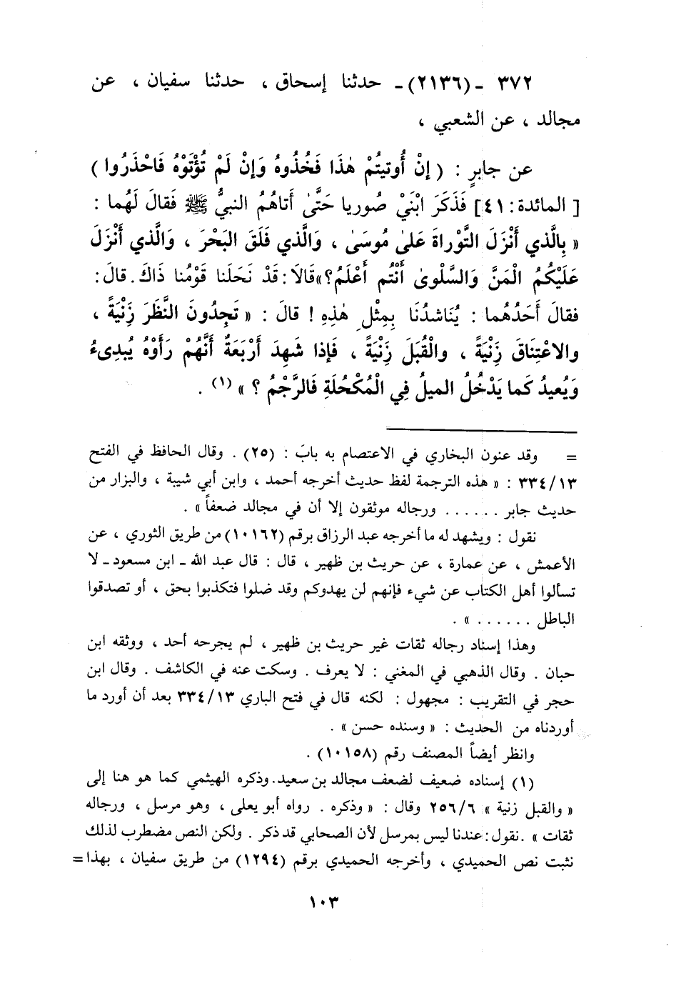 2136 - حَدَّثَنَا إِسْحَاقُ، حَدَّثَنَا سُفْيَانُ، عَنْ مُجَالِدٍ، عَنِ الشَّعْبِيِّ، عَنْ جَابِرٍ: {إِنْ أُوتِيتُمْ هَذَا فَخُذُوهُ وَإِنْ لَمْ تُؤْتَوْهُ فَاحْذَرُوا} [المائدة: 41] فَذَكَرَ ابْنَيْ صُورِيَا حَتَّى أَتَاهُمُ النَّبِيُّ صَلَّى اللهُ عَلَيْهِ وَسَلَّمَ فَقَالَ لَهُمَا: «§بِالَّذِي أَنْزَلَ التَّوْرَاةَ عَلَى مُوسَى، وَالَّذِي فَلَقَ الْبَحْرَ، وَالَّذِي أَنْزَلَ عَلَيْكُمُ الْمَنَّ وَالسَّلْوَى أَنْتُمْ أَعْلَمُ؟» قَالَا: قَدْ نَحَلَنَا قَوْمُنَا ذَاكَ. قَالَ: فَقَالَ أَحَدُهُمَا: يُنَاشِدُنَا بِمِثْلِ هَذِهِ قَالَ: «تَجِدُونَ النَّظَرَ زِنْيَةً، وَالَاعْتِنَاقَ زِنْيَةً، وَالْقُبَلَ زِنْيَةً، فَإِذَا شَهِدَ أَرْبَعَةٌ أَنَّهُمْ رَأَوْهُ يُبْدِيءُ وَيُعِيدُ كَمَا يَدْخُلُ الْمِيلُ فِي الْمُكْحُلَةِ فَالرَّجْمُ؟» Kإسناده ضعيف