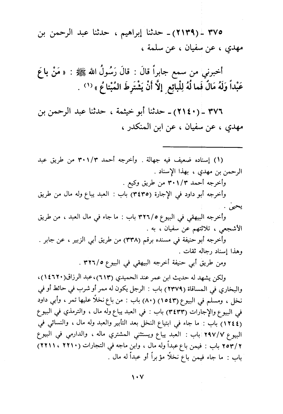 2139 - حَدَّثَنَا إِبْرَاهِيمُ، حَدَّثَنَا عَبْدُ الرَّحْمَنِ بْنُ مَهْدِيٍّ، عَنْ سُفْيَانَ، عَنْ سَلَمَةَ، أَخْبَرَنِي مَنْ، سَمِعَ جَابِرًا، قَالَ: قَالَ رَسُولُ اللَّهِ صَلَّى اللهُ عَلَيْهِ وَسَلَّمَ: «§مَنْ بَاعَ عَبْدًا وَلَهُ مَالٌ، فَمَالُهُ لِلْبَائِعِ، إِلَّا أَنْ يَشْتَرِطَ الْمُبْتَاعُ» Kإسناده ضعيف