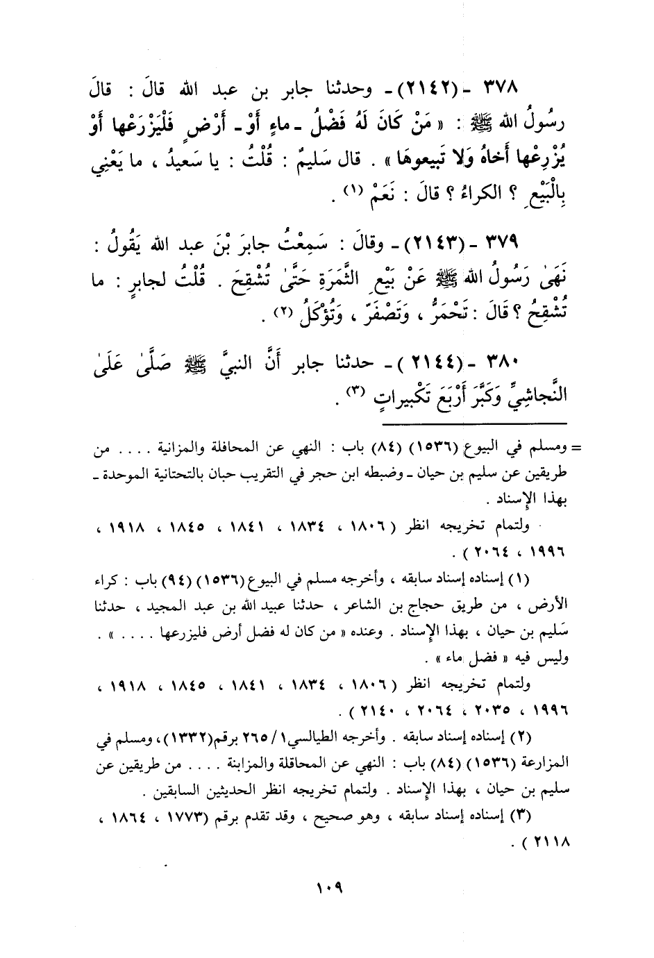 2142 - وَحَدَّثَنَا جَابِرُ بْنُ عَبْدِ اللَّهِ، قَالَ: قَالَ رَسُولُ اللَّهِ صَلَّى اللهُ عَلَيْهِ وَسَلَّمَ: «§مَنْ كَانَ لَهُ فَضْلُ مَاءٍ أَوْ أَرْضٍ فَلْيَزْرَعْهَا أَوْ يُزْرِعْهَا أَخَاهُ، وَلَا تَبِيعُوهَا». قَالَ سُلَيْمٌ: قُلْتُ: يَا سَعِيدُ، مَا يَعْنِي بِالْبَيْعِ الْكِرَاءُ؟ قَالَ: نَعَمْKأخرجه مسلم