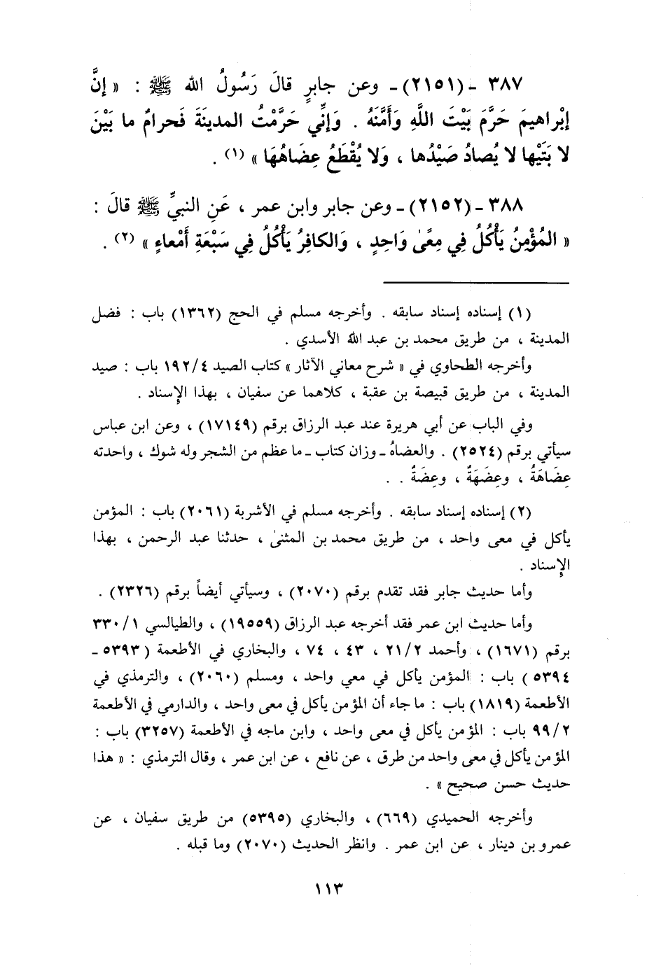 2152 - وَعَنْ جَابِرٍ، وَابْنِ عُمَرَ، عَنِ النَّبِيِّ صَلَّى اللهُ عَلَيْهِ وَسَلَّمَ قَالَ: «§الْمُؤْمِنُ يَأْكُلُ فِي مِعًى وَاحِدٍ، وَالْكَافِرُ يَأْكُلُ فِي سَبْعَةِ أَمْعَاءٍ» Kأخرجه مسلم