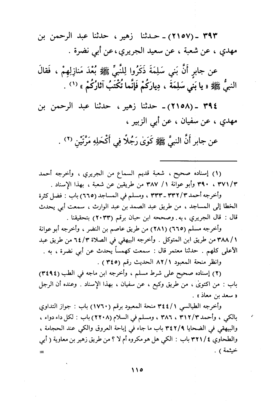 2157 - حَدَّثَنَا زُهَيْرٌ، حَدَّثَنَا عَبْدُ الرَّحْمَنِ بْنُ مَهْدِيٍّ، عَنْ شُعْبَةَ، عَنْ سَعِيدٍ الْجُرَيْرِيِّ، عَنْ أَبِي نَضْرَةَ، عَنْ جَابِرٍ، أَنَّ بَنِي سَلِمَةَ، ذَكَرُوا لِلنَّبِيِّ صَلَّى اللهُ عَلَيْهِ وَسَلَّمَ بُعْدَ مَنَازِلِهِمْ فَقَالَ النَّبِيُّ صَلَّى اللهُ عَلَيْهِ وَسَلَّمَ: «§يَا بَنِي سَلِمَةَ، دِيَارَكُمْ فَإِنَّمَا تُكْتَبُ آثَارُكُمْ» Kإسناده صحيح