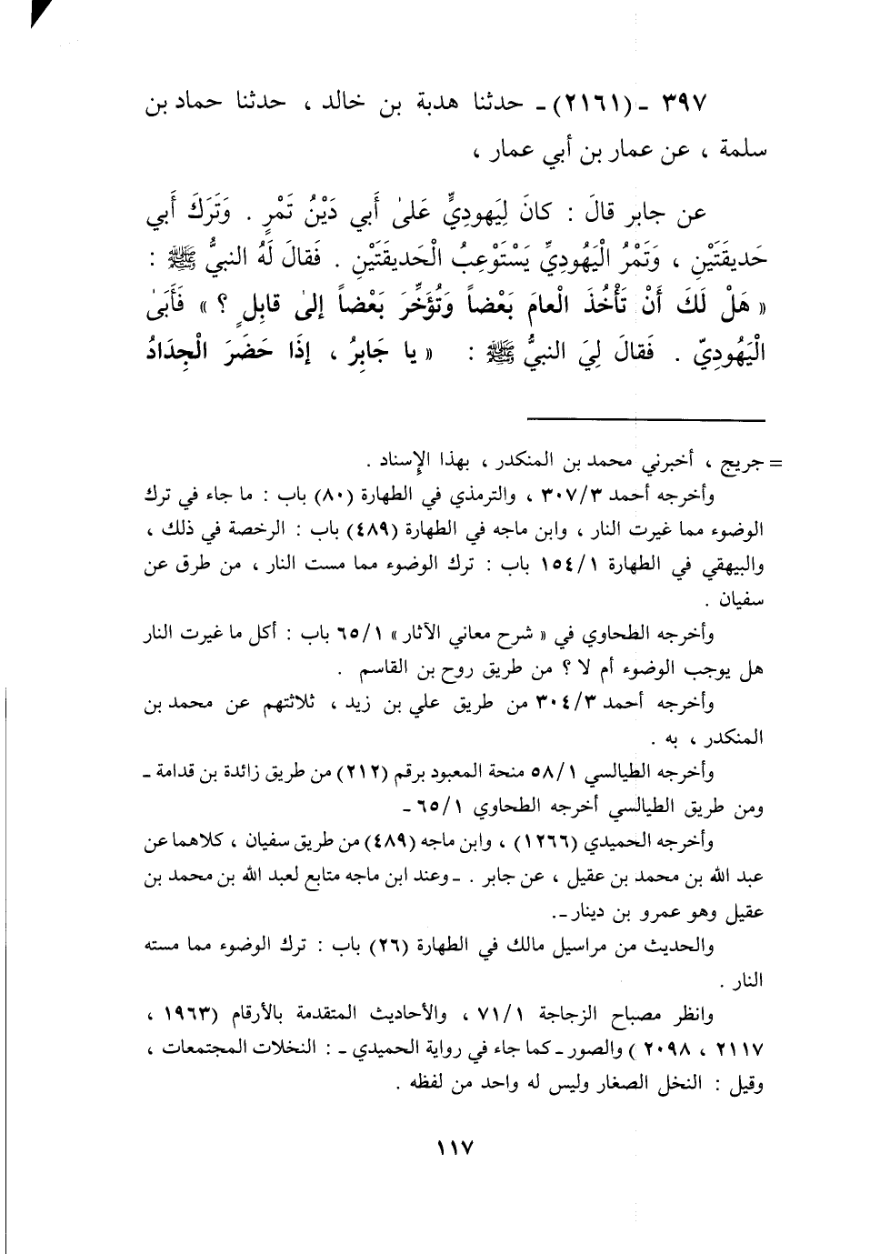 2161 - حَدَّثَنَا هُدْبَةُ بْنُ خَالِدٍ، حَدَّثَنَا حَمَّادُ بْنُ سَلَمَةَ، عَنْ عَمَّارِ بْنِ أَبِي عَمَّارٍ، عَنْ جَابِرٍ، قَالَ: كَانَ لِيَهُودِيٍّ عَلَى أَبِي دَيْنُ تَمْرٍ، وَتَرَكَ أَبِي حَدِيقَتَيْنِ، وَتَمْرُ الْيَهُودِيِّ يَسْتَوْعِبُ الْحَدِيقَتَيْنِ، فَقَالَ لَهُ النَّبِيُّ صَلَّى اللهُ عَلَيْهِ وَسَلَّمَ: «هَلْ لَكَ أَنْ تَأْخُذَ الْعَامَ بَعْضًا وَتُؤَخِّرَ بَعْضًا إِلَى قَابِلٍ؟» فَأَبَى الْيَهُودِيُّ. فَقَالَ لِي النَّبِيُّ صَلَّى اللهُ عَلَيْهِ وَسَلَّمَ: «يَا جَابِرُ §إِذَا حَضَرَ الْجِدَادُ فَآذِنِّي» فَآذَنْتُهُ، فَجَاءَ النَّبِيُّ صَلَّى اللهُ عَلَيْهِ وَسَلَّمَ وَأَبُو بَكْرٍ وَعُمَرُ، فَجُعِلَ يُكَالُ لَهُ مِنْ أَسْفَلِ النَّخْلِ وَالنَّبِيُّ صَلَّى اللهُ عَلَيْهِ وَسَلَّمَ يَدْعُو بِالْبَرَكَةِ، فَوَفَّيْنَاهُ حَقَّهُ، قَالَ عَمَّارٌ: أُرَاهُ مِنْ أَصْغَرِ الْحَدِيقَتَيْنِ. قَالَ: ثُمَّ أَتَيْنَاهُمْ بِرُطْبٍ فَأَكَلُوا وَشَرِبُوا، ثُمَّ قَالَ النَّبِيُّ صَلَّى اللهُ عَلَيْهِ وَسَلَّمَ: «هَذَا مِنَ النَّعِيمِ الَّذِي تُسْأَلُونَ عَنْهُ» Kإسناده صحيح