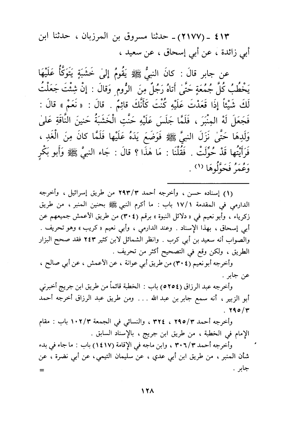 2177 - حَدَّثَنَا مَسْرُوقُ بْنُ الْمَرْزُبَانِ، حَدَّثَنَا ابْنُ أَبِي زَائِدَةَ، عَنْ أَبِي إِسْحَاقَ، عَنْ سَعِيدٍ، عَنْ جَابِرٍ، قَالَ: كَانَ النَّبِيُّ صَلَّى اللهُ عَلَيْهِ وَسَلَّمَ يَقُومُ إِلَى خَشَبَةٍ يَتَوَكَّأُ عَلَيْهَا يَخْطُبُ كُلَّ جُمُعَةٍ حَتَّى أَتَاهُ رَجُلٌ مِنَ الرُّومِ وَقَالَ: إِنْ شِئْتَ جَعَلْتُ لَكَ شَيْئًا إِذَا قَعَدْتَ عَلَيْهِ كُنْتَ كَأَنَّكَ قَائِمٌ؟ قَالَ: «نَعَمْ». قَالَ: فَجَعَلَ لَهُ الْمِنْبَرَ، §فَلَمَّا جَلَسَ عَلَيْهِ حَنَّتِ الْخَشَبَةُ حَنِينَ النَّاقَةِ عَلَى وَلَدِهَا حَتَّى نَزَلَ النَّبِيُّ صَلَّى اللهُ عَلَيْهِ وَسَلَّمَ فَوَضَعَ يَدَهُ عَلَيْهَا فَلَمَّا كَانَ مِنَ الْغَدِ فَرَأَيْتُهَا قَدْ حُوِّلَتْ فَقُلْنَا: مَا هَذَا؟ قَالَ: جَاءَ النَّبِيُّ صَلَّى اللهُ عَلَيْهِ وَسَلَّمَ وَأَبُو بَكْرٍ وَعُمَرُ فَحَوَّلُوهَاKإسناده حسن