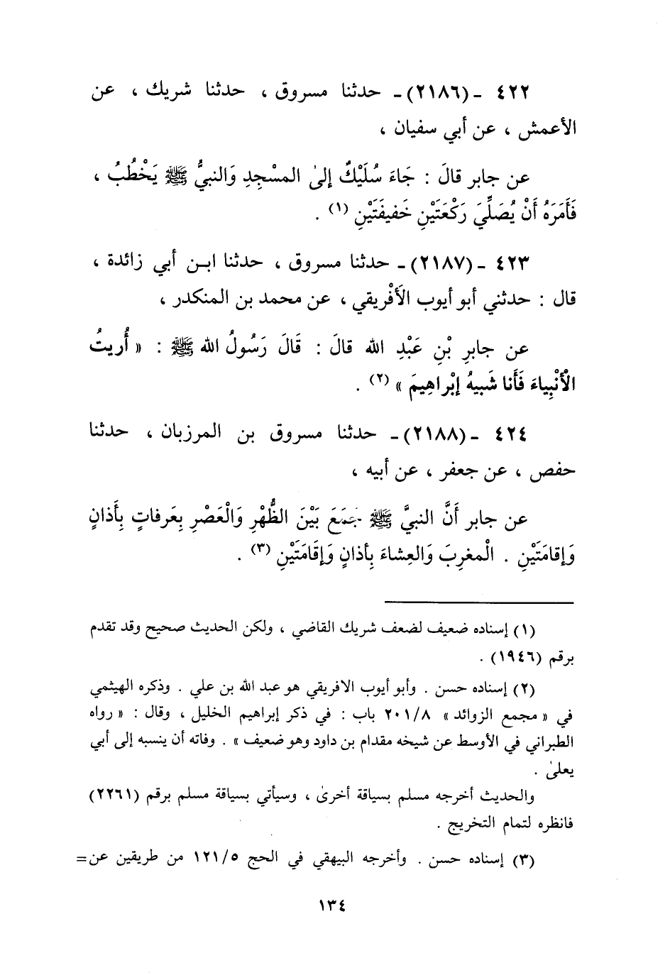 2188 - حَدَّثَنَا مَسْرُوقُ بْنُ الْمَرْزُبَانِ، حَدَّثَنَا حَفْصٌ، عَنْ جَعْفَرٍ، عَنْ أَبِيهِ، عَنْ جَابِرٍ، «أَنَّ النَّبِيَّ صَلَّى اللهُ عَلَيْهِ وَسَلَّمَ §جَمَعَ بَيْنَ الظُّهْرِ وَالْعَصْرِ بِعَرَفَاتٍ بِأَذَانٍ وَإِقَامَتَيْنِ، وَالْمَغْرِبِ وَالْعِشَاءِ بِأَذَانٍ وَإِقَامَتَيْنِ» Kإسناده حسن