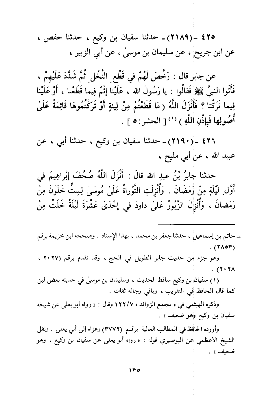 2190 - حَدَّثَنَا سُفْيَانُ بْنُ وَكِيعٍ، حَدَّثَنَا أَبِي، عَنْ عُبَيْدِ اللَّهِ، عَنْ أَبِي مَلِيحٍ، حَدَّثَنَا جَابِرُ بْنُ عَبْدِ اللَّهِ، قَالَ: «§أَنْزَلَ اللَّهُ صُحُفَ إِبْرَاهِيمَ فِي أَوَّلِ لَيْلَةٍ مِنْ رَمَضَانَ، وَأُنْزِلَتِ التَّوْرَاةُ عَلَى مُوسَى لِسِتٍّ خَلَوْنَ مِنْ رَمَضَانَ، وَأُنْزِلَ الزَّبُورُ عَلَى دَاوُدَ فِي إِحْدَى عَشْرَةَ لَيْلَةً خَلَتْ مِنْ -[136]- رَمَضَانَ، وَأُنْزِلَ الْقُرْآنُ عَلَى مُحَمَّدٍ صَلَّى اللهُ عَلَيْهِ وَسَلَّمَ فِي أَرْبَعٍ وَعِشْرِينَ خَلَتْ مِنْ رَمَضَانَ»