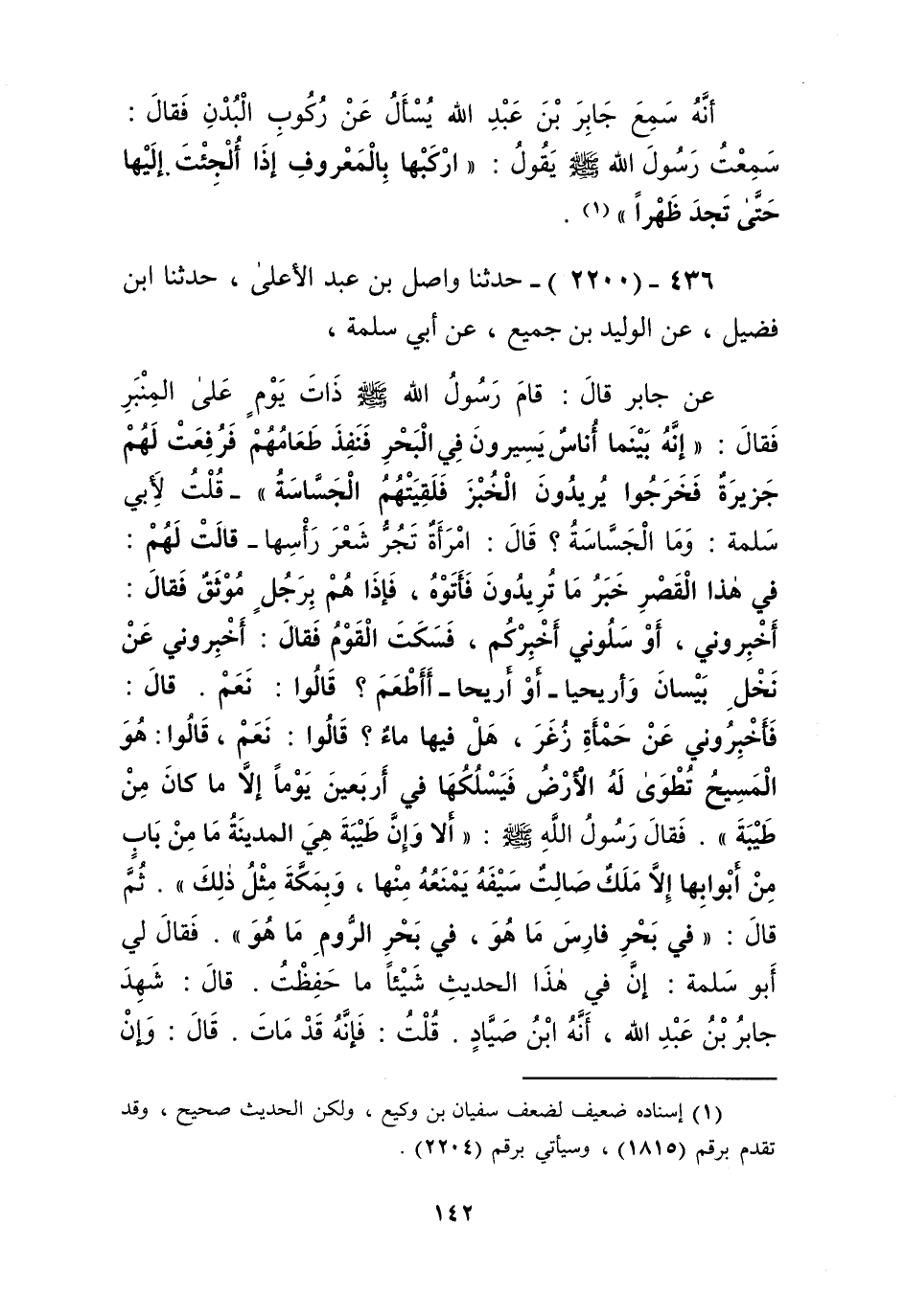 2200 - حَدَّثَنَا وَاصِلُ بْنُ عَبْدِ الْأَعْلَى، حَدَّثَنَا ابْنُ فُضَيْلٍ، عَنِ الْوَلِيدِ بْنِ جَمِيعٍ، عَنْ أَبِي سَلَمَةَ، عَنْ جَابِرٍ، قَالَ: قَامَ رَسُولُ اللَّهِ صَلَّى اللهُ عَلَيْهِ وَسَلَّمَ ذَاتَ يَوْمٍ عَلَى الْمِنْبَرِ فَقَالَ: " إِنَّهُ §بَيْنَمَا أُنَاسٌ يَسِيرُونَ فِي الْبَحْرِ فَنَفَدَ طَعَامُهُمْ، فَرُفِعَتْ لَهُمْ جَزِيرَةٌ فَخَرَجُوا يُرِيدُونَ الْخُبْزَ فَلَقِيَتْهُمُ الْجَسَّاسَةُ - قُلْتُ لِأَبِي سَلَمَةَ: وَمَا الْجَسَّاسَةُ؟ قَالَ: امْرَأَةٌ تَجُرُّ شَعْرَ رَأْسِهَا - قَالَتْ لَهُمْ: فِي هَذَا الْقَصْرِ خَبَرُ مَا تُرِيدُونَ فَأَتَوْهُ، فَإِذَا هُمْ بِرَجُلٍ مُوثَقٍ فَقَالَ: أَخْبِرُونِي، أَوْ سَلُونِي أُخْبِرْكُمْ فَسَكَتَ الْقَوْمُ، فَقَالَ: أَخْبِرُونِي عَنْ نَخْلِ بَيْسَانَ وَأَرِيحِيَا - أَوْ أَرِيحَا - أَأَطْعَمَ؟ قَالُوا: نَعَمْ، قَالَ: فَأَخْبِرُونِي عَنْ حَمْأَةِ زُغَرَ هَلْ فِيهَا مَاءٌ؟ قَالُوا: نَعَمْ. قَالُوا: هُوَ الْمَسِيحُ تُطْوَى لَهُ الْأَرْضُ فَيَسْلُكُهَا فِي أَرْبَعِينَ يَوْمًا إِلَّا مَا كَانَ مِنْ طَيْبَةَ، فَقَالَ رَسُولُ اللَّهِ صَلَّى اللهُ عَلَيْهِ وَسَلَّمَ: «أَلَا وَإِنَّ طَيْبَةَ هِيَ الْمَدِينَةُ مَا مِنْ بَابٍ مِنْ أَبْوَابِهَا إِلَّا مَلَكٌ صَالِتٌ سَيْفَهُ يَمْنَعُهُ مِنْهَا، وَبِمَكَّةَ مِثْلُ ذَلِكَ» ثُمَّ قَالَ: «فِي بَحْرِ فَارِسَ مَا هُوَ فِي بَحْرِ الرُّومِ مَا هُوَ». فَقَالَ لِي أَبُو سَلَمَةَ: إِنَّ فِي هَذَا الْحَدِيثِ شَيْئًا مَا حَفِظْتُ قَالَ: شَهِدَ جَابِرُ بْنُ عَبْدِ اللَّهِ أَنَّهُ ابْنُ صَيَّادٍ قُلْتُ: فَإِنَّهُ قَدْ مَاتَ، قَالَ: وَإِنْ مَاتَ. قُلْتُ: فَإِنَّهُ أَسْلَمَ، قَالَ: وَإِنْ أَسْلَمَ، قُلْتُ: فَإِنَّهُ قَدْ دَخَلَ الْمَدِينَةَ، قَالَ: وَإِنْ دَخَلَ الْمَدِينَةَKإسناده صحيح