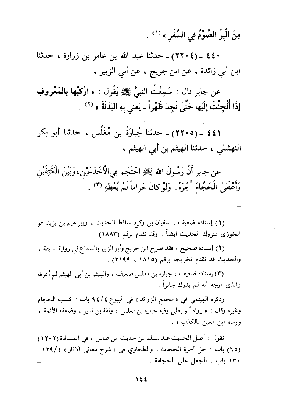 2205 - حَدَّثَنَا جُبَارَةُ بْنُ مُغَلِّسٍ، حَدَّثَنَا أَبُو بَكْرٍ النَّهْشَلِيُّ، حَدَّثَنَا الْهَيْثَمُ بْنُ أَبِي الْهَيْثَمِ، عَنْ جَابِرٍ، «أَنَّ رَسُولَ اللَّهِ صَلَّى اللهُ عَلَيْهِ وَسَلَّمَ §احْتَجَمَ فِي الْأَخْدَعَيْنِ، وَبَيْنَ الْكَتِفَيْنِ وَأَعْطَى الْحَجَّامَ أَجْرَهُ، وَلَوْ كَانَ حَرَامًا لَمْ يُعْطِهِ» Kإسناده ضعيف
