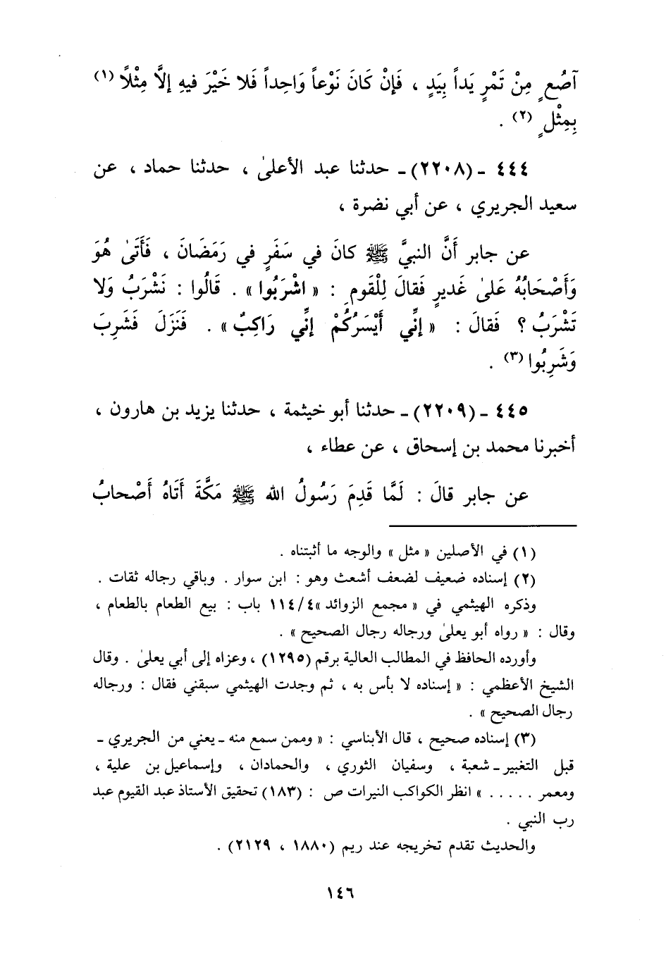 2208 - حَدَّثَنَا عَبْدُ الْأَعْلَى، حَدَّثَنَا حَمَّادٌ، عَنْ سَعِيدٍ الْجُرَيْرِيِّ، عَنْ أَبِي نَضْرَةَ، عَنْ جَابِرٍ، أَنَّ النَّبِيَّ صَلَّى اللهُ عَلَيْهِ وَسَلَّمَ كَانَ فِي سَفَرٍ فِي رَمَضَانَ فَأَتَى هُوَ وَأَصْحَابُهُ عَلَى غَدِيرٍ فَقَالَ لِلْقَوْمِ: «اشْرَبُوا» قَالُوا: نَشْرَبُ وَلَا تَشْرَبُ؟ فَقَالَ: «§إِنِّي أَيَسَرُكُمْ إِنِّي رَاكِبٌ» فَنَزَلَ فَشَرِبَ وَشَرِبُواKإسناده صحيح