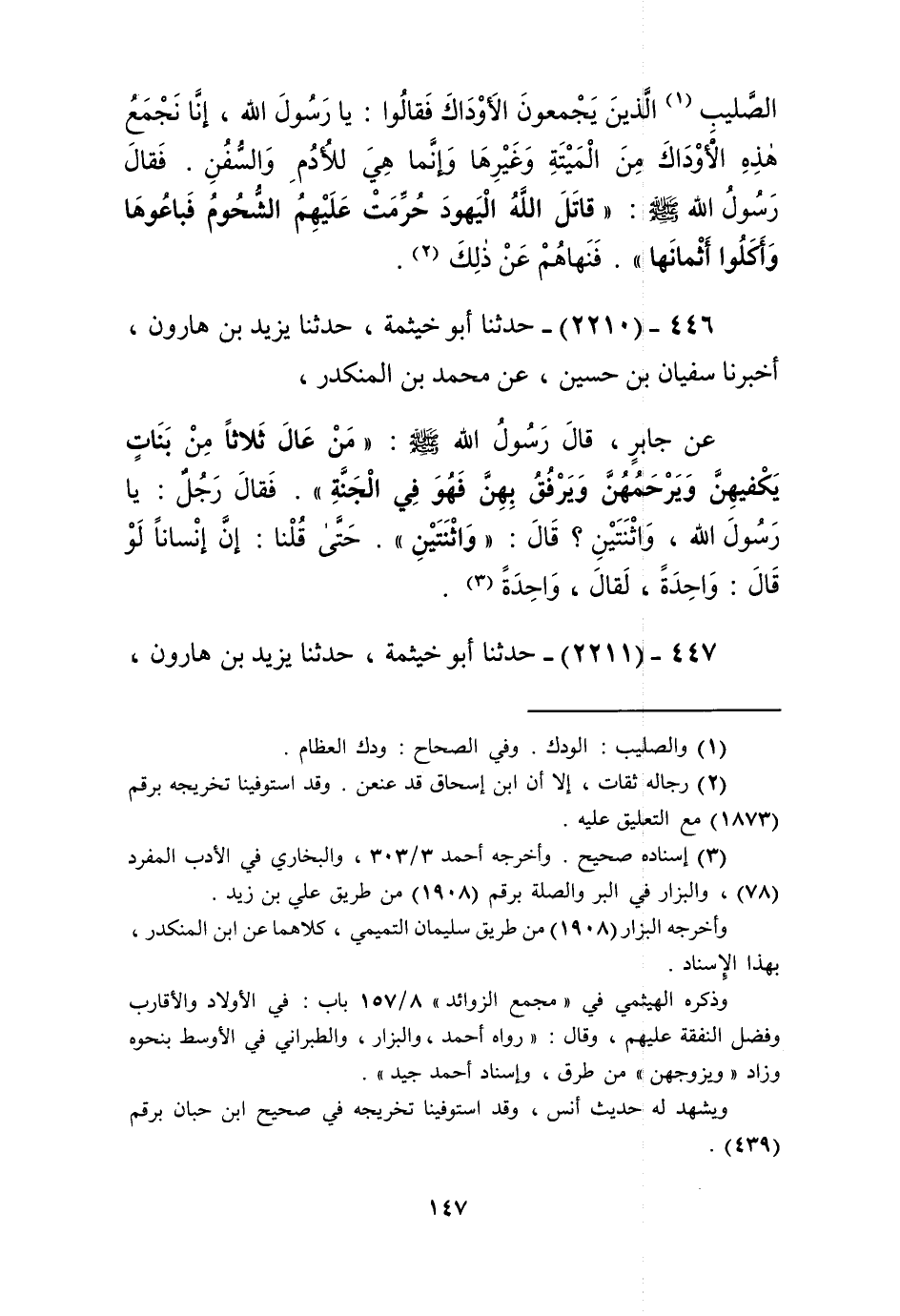 2210 - حَدَّثَنَا أَبُو خَيْثَمَةَ، حَدَّثَنَا يَزِيدُ بْنُ هَارُونَ، أَخْبَرَنَا سُفْيَانُ بْنُ حُسَيْنٍ، عَنْ مُحَمَّدِ بْنِ الْمُنْكَدِرِ، عَنْ جَابِرٍ، قَالَ رَسُولُ اللَّهِ صَلَّى اللهُ عَلَيْهِ وَسَلَّمَ: «§مَنْ عَالَ ثَلَاثًا مِنْ بَنَاتٍ يَكْفِيهِنَّ وَيَرْحَمُهُنَّ وَيَرْفُقُ بِهِنَّ فَهُوَ فِي الْجَنَّةِ»، فَقَالَ رَجُلٌ: يَا رَسُولَ اللَّهِ وَاثْنَتَيْنِ؟ قَالَ: «وَاثْنَتَيْنِ» حَتَّى قُلْنَا: إِنَّ إِنْسَانًا لَوْ قَالَ: وَاحِدَةً، لَقَالَ: وَاحِدَةًKإسناده صحيح