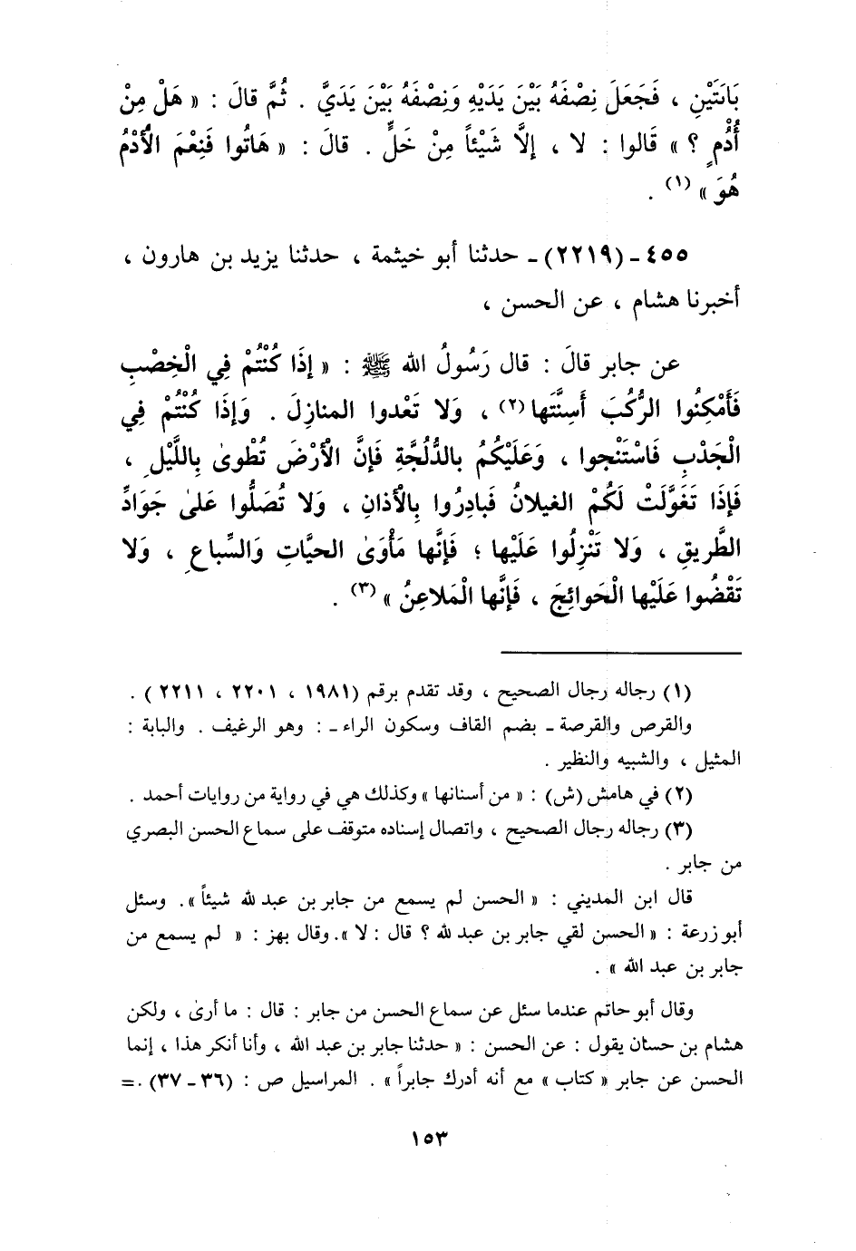2219 - حَدَّثَنَا أَبُو خَيْثَمَةَ، حَدَّثَنَا يَزِيدُ بْنُ هَارُونَ، أَخْبَرَنَا هِشَامٌ، عَنِ الْحَسَنِ، عَنْ جَابِرٍ، قَالَ: قَالَ رَسُولُ اللَّهِ صَلَّى اللهُ عَلَيْهِ وَسَلَّمَ: «§إِذَا كُنْتُمْ فِي الْخِصْبِ فَأَمْكِنُوا الرُّكُبَ أَسِنَّتَهَا، وَلَا تَعْدُوا الْمَنَازِلَ، وَإِذَا كُنْتُمْ فِي الْجَدْبِ فَاسْتَنْجُوا، وَعَلَيْكُمْ بِالدُّلُجَّةِ فَإِنَّ الْأَرْضَ تُطْوَى بِاللَّيْلِ، فَإِذَا تَغَوَّلَتْ لَكُمُ الْغِيلَانُ فَبَادِرُوا بِالْأَذَانِ، وَلَا تُصَلُّوا عَلَى جَوَادِّ الطَّرِيقِ، وَلَا تَنْزِلُوا عَلَيْهَا فَإِنَّهَا مَأْوَى الْحَيَّاتِ وَالسِّبَاعِ، وَلَا تَقْضُوا عَلَيْهَا الْحَوَائِجَ فَإِنَّهَا الْمَلَاعِنُ» Kرجاله رجال الصحيح