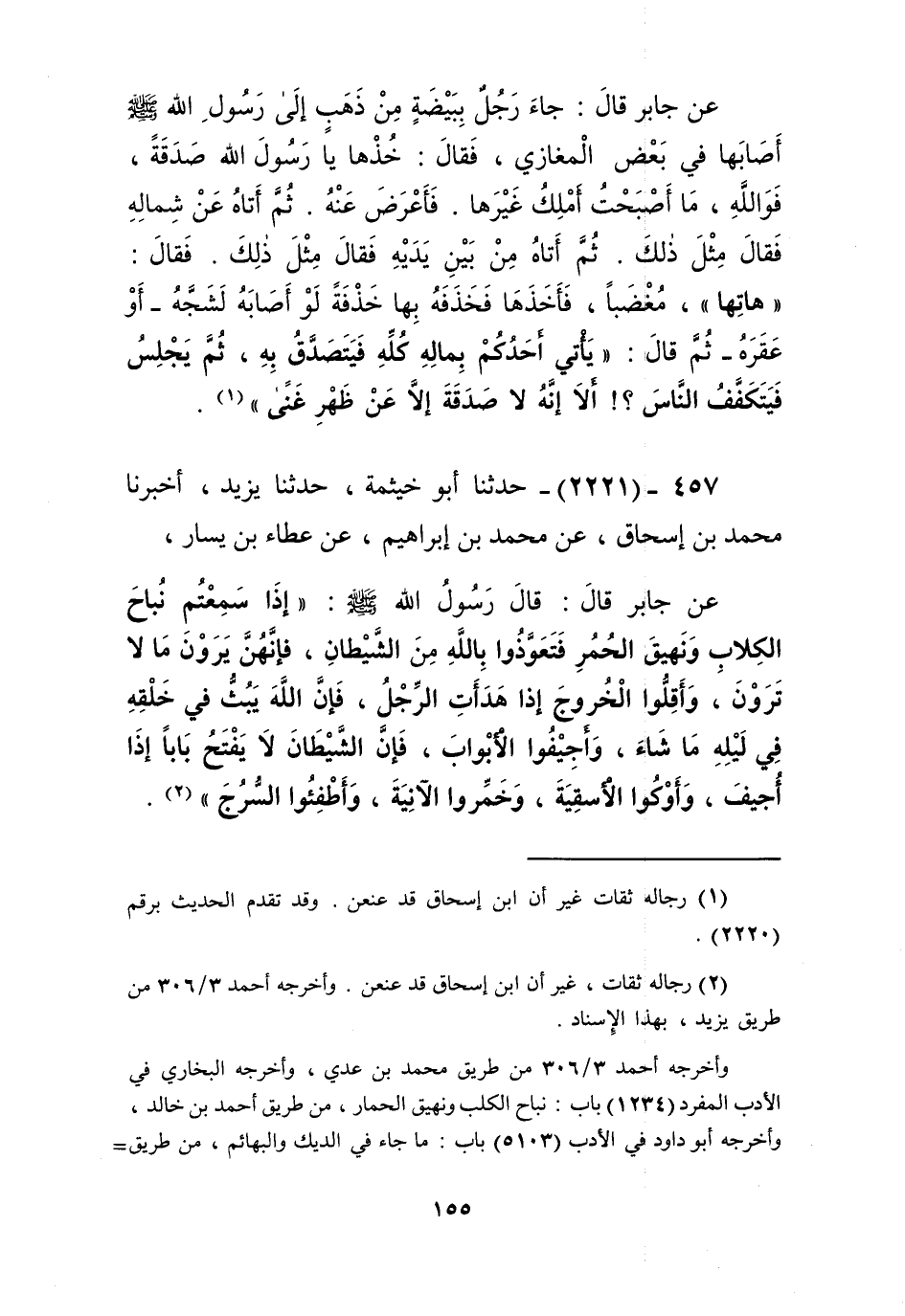 2221 - حَدَّثَنَا أَبُو خَيْثَمَةَ، حَدَّثَنَا يَزِيدُ، أَخْبَرَنَا مُحَمَّدُ بْنُ إِسْحَاقَ، عَنْ مُحَمَّدِ بْنِ إِبْرَاهِيمَ، عَنْ عَطَاءِ بْنِ يَسَارٍ، عَنْ جَابِرٍ، قَالَ: قَالَ رَسُولُ اللَّهِ صَلَّى اللهُ عَلَيْهِ وَسَلَّمَ: «§إِذَا سَمِعْتُمْ نُبَاحَ الْكِلَابِ، وَنَهِيقَ الْحُمُرِ فَتَعَوَّذُوا بِاللَّهِ مِنَ الشَّيْطَانِ، فَإِنَّهُنَّ يَرَوْنَ مَا لَا تَرَوْنَ، وَأَقِلُّوا الْخُرُوجَ إِذَا هَدَأَتِ الرِّجْلُ فَإِنَّ اللَّهَ يَبُثُّ فِي خَلْقِهِ فِي لَيْلِهِ مَا شَاءَ، وَأَجِيفُوا الْأَبْوَابَ فَإِنَّ الشَّيْطَانَ لَا يَفْتَحُ بَابًا إِذَا أُجِيفَ، وَأَوْكُوا الْأَسْقِيَةَ، وَخَمِّرُوا الْآنِيَةَ، وَأَطْفِئُوا السُّرُجَ» Kرجاله ثقات
