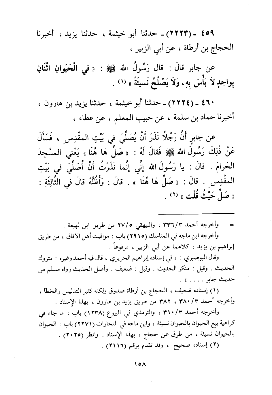 2224 - حَدَّثَنَا أَبُو خَيْثَمَةَ، حَدَّثَنَا يَزِيدُ بْنُ هَارُونَ، أَخْبَرَنَا حَمَّادُ بْنُ سَلَمَةَ، عَنْ حَبِيبٍ الْمُعَلِّمِ، عَنْ عَطَاءٍ، عَنْ جَابِرٍ، أَنَّ §رَجُلًا نَذَرَ أَنْ يُصَلِّيَ فِي بَيْتِ الْمَقْدِسِ فَسَأَلَ عَنْ ذَلِكَ رَسُولَ اللَّهِ صَلَّى اللهُ عَلَيْهِ وَسَلَّمَ، فَقَالَ لَهُ: «صَلِّ هَا هُنَا» - يَعْنِي الْمَسْجِدَ الْحَرَامَ -، قَالَ: يَا رَسُولَ اللَّهِ إِنِّي إِنَّمَا نَذَرْتُ أَنْ أُصَلِّيَ فِي بَيْتِ الْمَقْدِسِ، قَالَ: «صَلِّ هَا هُنَا» قَالَ: وَأَظُنُّهُ قَالَ فِي الثَّالِثَةِ: «صَلِّ حَيْثُ قُلْتَ» Kإسناده صحيح