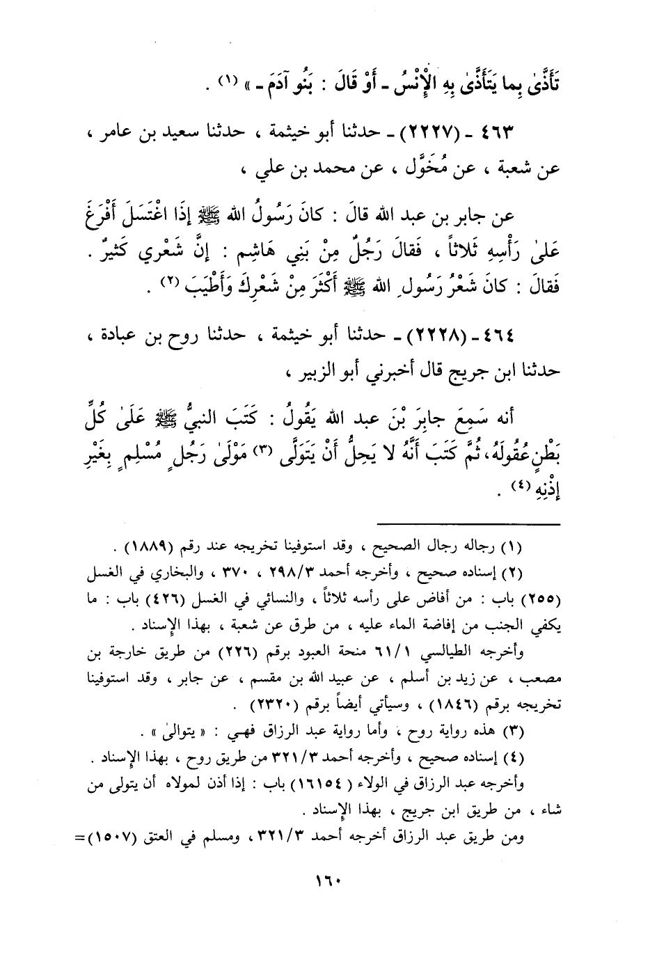 2227 - حَدَّثَنَا أَبُو خَيْثَمَةَ، حَدَّثَنَا سَعِيدُ بْنُ عَامِرٍ، عَنْ شُعْبَةَ، عَنْ مُخَوَّلٍ، عَنْ مُحَمَّدِ بْنِ عَلِيٍّ، عَنْ جَابِرِ بْنِ عَبْدِ اللَّهِ، قَالَ: «كَانَ رَسُولُ اللَّهِ صَلَّى اللهُ عَلَيْهِ وَسَلَّمَ §إِذَا اغْتَسَلَ أَفْرَغَ عَلَى رَأْسِهِ ثَلَاثًا»، فَقَالَ رَجُلٌ مِنْ بَنِي هَاشِمٍ: إِنَّ شَعْرِي كَثِيرٌ. فَقَالَ: «كَانَ شَعْرُ رَسُولِ اللَّهِ صَلَّى اللهُ عَلَيْهِ وَسَلَّمَ أَكْثَرَ مِنْ شَعْرِكَ وَأَطْيَبَ» Kإسناده صحيح