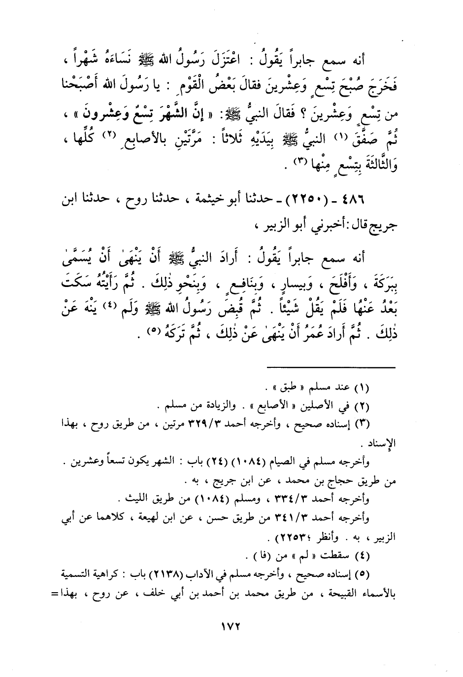 2250 - حَدَّثَنَا أَبُو خَيْثَمَةَ، حَدَّثَنَا رَوْحٌ، حَدَّثَنَا ابْنُ جُرَيْجٍ قَالَ: أَخْبَرَنِي أَبُو الزُّبَيْرِ أَنَّهُ سَمِعَ جَابِرًا يَقُولُ: أَرَادَ النَّبِيُّ صَلَّى اللهُ عَلَيْهِ وَسَلَّمَ أَنْ «§يَنْهَى أَنْ يُسَمَّى بِبَرَكَةَ، وَأَفْلَحَ، وَبِيَسَارٍ، وَبِنَافِعٍ وَبِنَحْوِ ذَلِكَ. ثُمَّ رَأَيْتُهُ سَكَتَ بَعْدُ عَنْهَا فَلَمْ يَقُلْ شَيْئًا، ثُمَّ قُبِضَ رَسُولُ اللَّهِ صَلَّى اللهُ عَلَيْهِ وَسَلَّمَ وَلَمْ يَنْهَ عَنْ ذَلِكَ. ثُمَّ أَرَادَ عُمَرُ أَنْ يَنْهَى عَنْ ذَلِكَ ثُمَّ تَرَكَهُ» Kإسناده صحيح