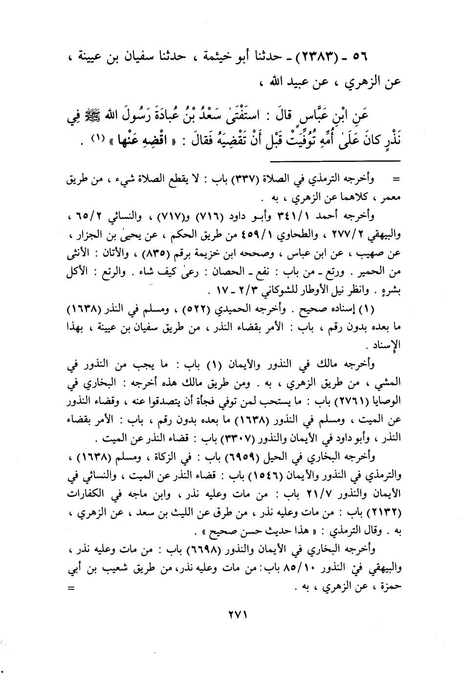 2383 - حَدَّثَنَا أَبُو خَيْثَمَةَ، حَدَّثَنَا سُفْيَانُ بْنُ عُيَيْنَةَ، عَنِ الزُّهْرِيِّ، عَنْ عُبَيْدِ اللَّهِ، عَنِ ابْنِ عَبَّاسٍ قَالَ: " §اسْتَفْتَى سَعْدُ بْنُ عُبَادَةَ رَسُولَ اللَّهِ صَلَّى اللهُ عَلَيْهِ وَسَلَّمَ فِي نَذْرٍ كَانَ عَلَى أُمِّهِ تُوُفِّيَتْ قَبْلَ أَنْ تَقْضِيَهُ فَقَالَ: «اقْضِهِ عَنْهَا» Kإسناده صحيح