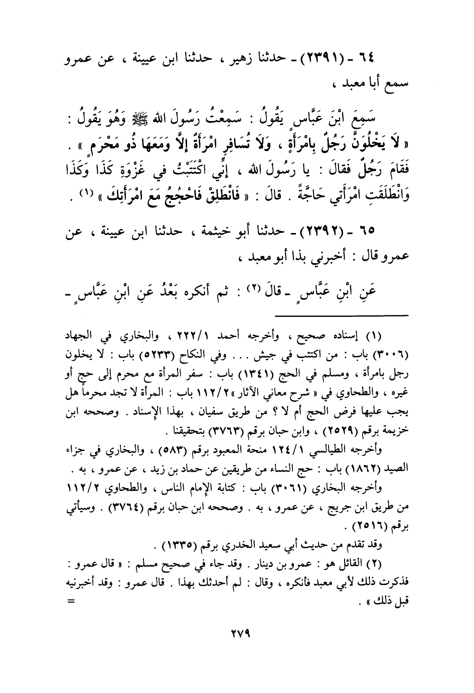 2391 - حَدَّثَنَا زُهَيْرٌ، حَدَّثَنَا ابْنُ عُيَيْنَةَ، عَنْ عَمْرٍو، سَمِعَ أَبَا مَعْبَدٍ، سَمِعَ ابْنَ عَبَّاسٍ يَقُولُ: سَمِعْتُ رَسُولَ اللَّهِ صَلَّى اللهُ عَلَيْهِ وَسَلَّمَ وَهُوَ يَقُولُ: «§لَا يَخْلُوَنَّ رَجُلٌ بِامْرَأَةٍ، وَلَا تُسَافِرِ امْرَأَةٌ إِلَّا وَمَعَهَا ذُو مَحْرَمٍ» فَقَامَ رَجُلٌ فَقَالَ: يَا رَسُولَ اللَّهِ إِنِّي اكْتَتَبْتُ فِي غَزْوَةِ كَذَا وَكَذَا وَانْطَلَقْتِ امْرَأَتِي حَاجَّةٌ. قَالَ: «فَانْطَلِقْ فَاحْجُجْ مَعَ امْرَأَتِكَ» Kإسناده صحيح