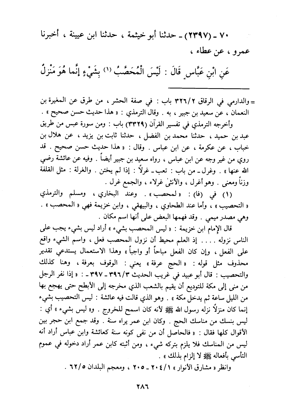 2397 - حَدَّثَنَا أَبُو خَيْثَمَةَ، حَدَّثَنَا ابْنُ عُيَيْنَةَ، أَخْبَرَنَا عَمْرٌو، عَنْ عَطَاءٍ، عَنِ ابْنِ عَبَّاسٍ قَالَ: «§لَيْسَ الْمُحَصَّبُ بِشَيْءٍ إِنَّمَا هُوَ مَنْزِلٌ نَزَلَهُ رَسُولُ اللَّهِ صَلَّى اللهُ عَلَيْهِ وَسَلَّمَ» Kإسناده صحيح