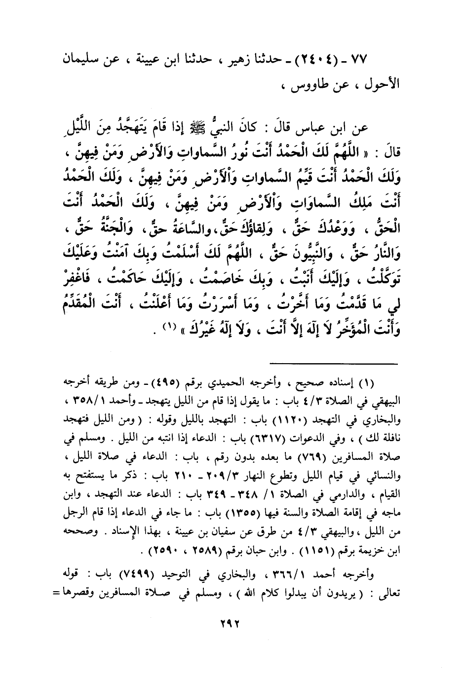 2404 - حَدَّثَنَا زُهَيْرٌ، حَدَّثَنَا ابْنُ عُيَيْنَةَ، عَنْ سُلَيْمَانَ الْأَحْوَلِ، عَنْ طَاوُوسٍ، عَنِ ابْنِ عَبَّاسٍ قَالَ: كَانَ النَّبِيُّ صَلَّى اللهُ عَلَيْهِ وَسَلَّمَ إِذَا قَامَ يَتَهَجَّدُ مِنَ اللَّيْلِ قَالَ: «§اللَّهُمَّ لَكَ الْحَمْدُ أَنْتَ نُورُ السَّمَاوَاتِ وَالْأَرْضِ وَمَنْ فِيهِنَّ، وَلَكَ الْحَمْدُ أَنْتَ قَيِّمُ السَّمَاوَاتِ وَالْأَرْضِ وَمَنْ فِيهِنَّ، وَلَكَ الْحَمْدُ أَنْتَ مَلَكُ السَّمَاوَاتِ وَالْأَرْضِ وَمَنْ فِيهِنَّ، وَلَكَ الْحَمْدُ أَنْتَ الْحَقُّ وَوَعْدُكَ حَقٌّ. وَلِقَاؤُكَ حَقٌّ، وَالسَّاعَةُ حَقٌّ، وَالْجَنَّةُ حَقٌّ، وَالنَّارُ حَقٌّ، وَالنَّبِيُّونَ حَقٌّ. اللَّهُمَّ لَكَ أَسْلَمْتُ وَبِكَ آمَنْتُ وَعَلَيْكَ تَوَكَّلْتُ وَإِلَيْكَ أَنَبْتُ، وَبِكَ خَاصَمْتُ، وَإِلَيْكَ حَاكَمْتُ، فَاغْفِرْ لِي مَا قَدِمْتُ وَمَا أَخَّرْتُ، وَمَا أَسْرَرْتُ وَمَا أَعْلَنْتُ. أَنْتَ الْمُقَدَّمُ وَأَنْتَ الْمُؤَخَّرُ لَا إِلَهَ إِلَّا أَنْتَ، وَلَا إِلَهَ غَيْرُكَ» Kإسناده صحيح