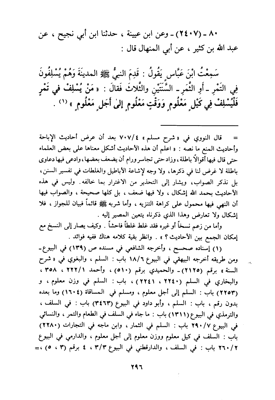 2407 - وَعَنِ ابْنِ عُيَيْنَةَ، حَدَّثَنَا ابْنُ أَبِي نَجِيحٍ، عَنْ عَبْدِ اللَّهِ بْنِ كَثِيرٍ، عَنْ أَبِي الْمِنْهَالِ قَالَ: سَمِعْتُ ابْنَ عَبَّاسٍ يَقُولُ: قَدِمَ النَّبِيُّ صَلَّى اللهُ عَلَيْهِ وَسَلَّمَ الْمَدِينَةَ وَهُمْ يُسْلِفُونَ فِي التَّمْرِ أَوِ الثَّمَرِ السَّنَتَيْنِ وَالثَّلَاثَ فَقَالَ: «§مَنْ يُسَلِّفْ فِي تَمْرٍ فَلْيُسْلِفْ فِي كَيْلٍ مَعْلُومٍ وَوَقْتٍ مَعْلُومٍ إِلَى أَجْلٍ مَعْلُومٍ» Kإسناده صحيح
