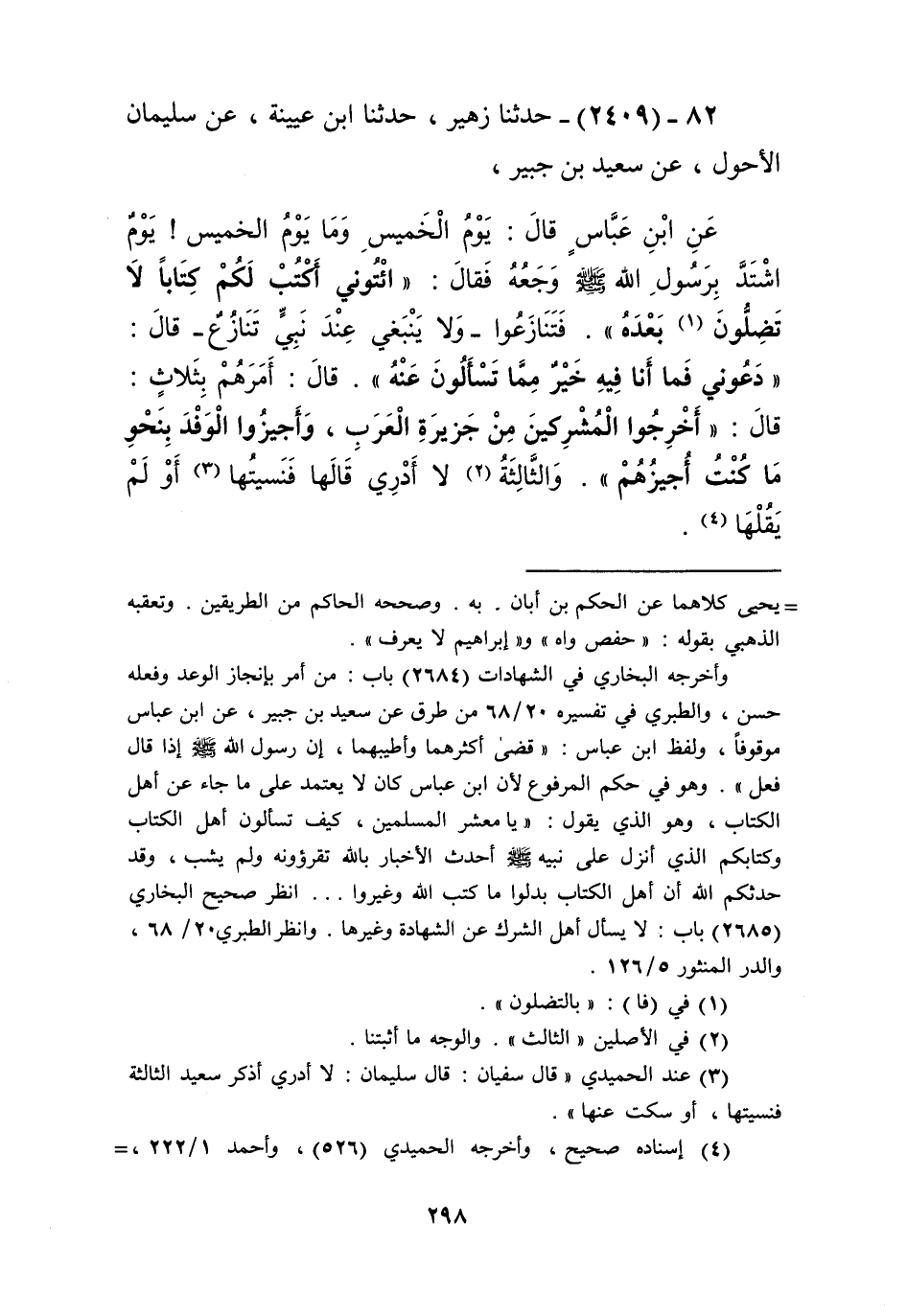 2409 - حَدَّثَنَا زُهَيْرٌ، حَدَّثَنَا ابْنُ عُيَيْنَةَ، عَنْ سُلَيْمَانَ الْأَحْوَلِ، عَنْ سَعِيدِ بْنِ جُبَيْرٍ، عَنِ ابْنِ عَبَّاسٍ قَالَ: يَوْمُ الْخَمِيسِ وَمَا يَوْمُ الْخَمِيسِ يَوْمٌ اشْتَدَّ بِرَسُولِ اللَّهِ صَلَّى اللهُ عَلَيْهِ وَسَلَّمَ وَجَعُهُ فَقَالَ: «§ائْتُونِي أَكْتُبْ لَكُمْ كِتَابًا لَا تَضِلُّونَ بَعْدَهُ». - فَتَنَازَعُوا وَلَا يَنْبَغِي عِنْدَ نَبِيٍّ تَنَازُعٌ - قَالَ: «دَعُونِي فَمَا أَنَا فِيهِ خَيْرٌ مِمَّا تُسْأَلُونَ عَنْهُ». قَالَ: أَمَرَهُمْ بِثَلَاثٍ: قَالَ: «أَخْرِجُوا الْمُشْرِكِينَ مِنْ جَزِيرَةِ الْعَرَبِ، وَأَجِيزُوا الْوَفْدَ بِنَحْوِ مَا كُنْتُ أُجِيزُهُمْ». وَالثَّالِثَةُ لَا أَدْرِي قَالَهَا فَنَسِيتُهَا، أَوْ لَمْ يَقُلْهَاKإسناده صحيح