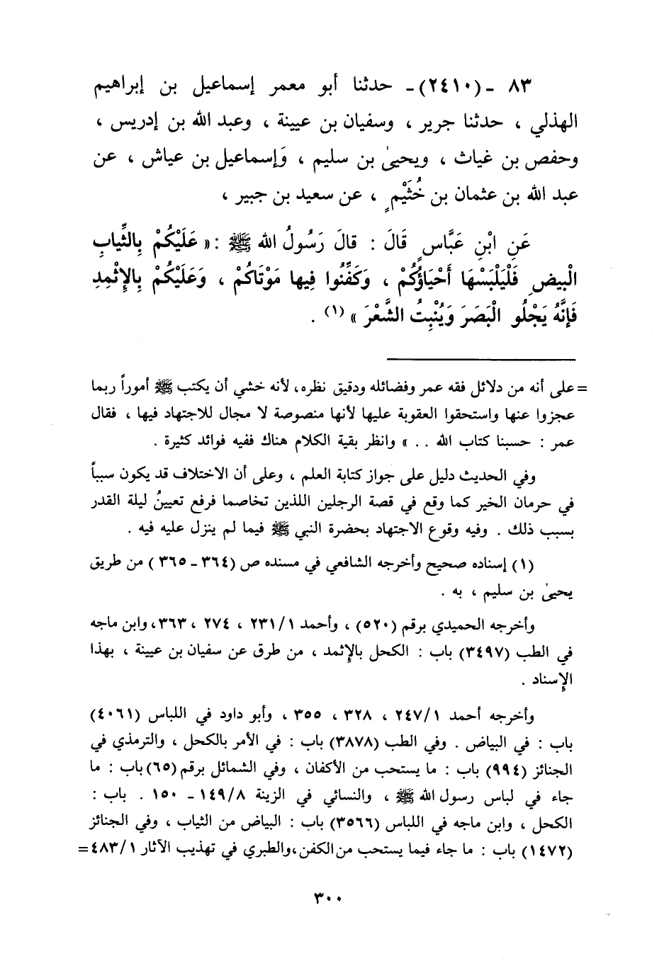 2410 - حَدَّثَنَا أَبُو مَعْمَرٍ إِسْمَاعِيلُ بْنُ إِبْرَاهِيمَ الْهُذَلِيُّ حَدَّثَنَا جَرِيرٌ، وَسُفْيَانُ بْنُ عُيَيْنَةَ، وَعَبْدُ اللَّهِ بْنُ إِدْرِيسَ، وَحَفْصُ بْنُ غِيَاثٍ، وَيَحْيَى بْنُ سُلَيْمٍ، وَإِسْمَاعِيلُ بْنُ عَيَّاشٍ، عَنْ عَبْدِ اللَّهِ بْنِ عُثْمَانَ بْنِ خُثَيْمٍ، عَنْ سَعِيدِ بْنِ جُبَيْرٍ، عَنِ ابْنِ عَبَّاسٍ قَالَ: قَالَ رَسُولُ اللَّهِ صَلَّى اللهُ عَلَيْهِ وَسَلَّمَ: «§عَلَيْكُمْ بِالثِّيَابِ الْبِيضِ، فَلْيَلْبَسْهَا أَحْيَاؤُكُمْ، وَكَفِّنُوا فِيهَا مَوْتَاكُمْ، وَعَلَيْكُمْ بِالْإِثْمِدِ؛ فَإِنَّهُ يَجْلُو الْبَصَرَ وَيُنْبِتُ الشَّعْرِ» Kإسناده صحيح