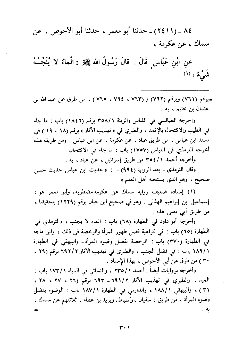 2411 - حَدَّثَنَا أَبُو مَعْمَرٍ، حَدَّثَنَا أَبُو الْأَحْوَصِ، عَنْ سِمَاكٍ، عَنْ عِكْرِمَةَ، عَنِ ابْنِ عَبَّاسٍ قَالَ: قَالَ رَسُولُ اللَّهِ صَلَّى اللهُ عَلَيْهِ وَسَلَّمَ: «§الْمَاءُ لَا يُنَجِّسُهُ شَيْءٌ» Kإسناده ضعيف