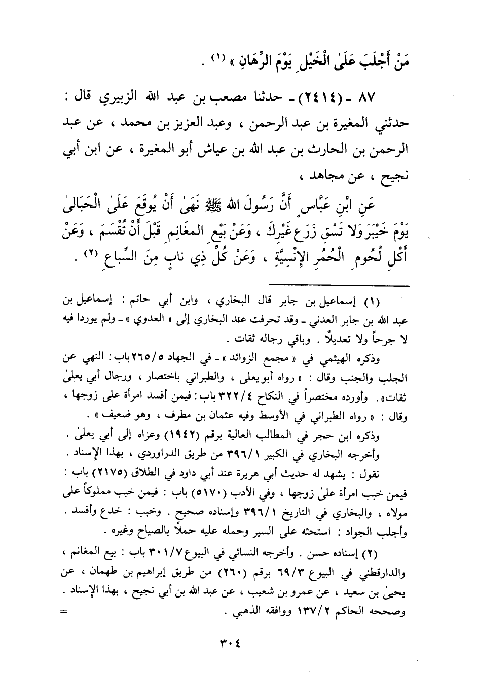 2414 - حَدَّثَنَا مُصْعَبُ بْنُ عَبْدِ اللَّهِ الزُّبَيْرِيُّ قَالَ: حَدَّثَنِي الْمُغِيرَةُ بْنُ عَبْدِ الرَّحْمَنِ، وَعَبْدُ الْعَزِيزِ بْنُ مُحَمَّدٍ، عَنْ عَبْدِ الرَّحْمَنِ بْنِ الْحَارِثِ بْنِ عَبْدِ اللَّهِ بْنِ عَيَّاشِ ابْنِ الْمُغِيرَةِ، عَنِ ابْنِ أَبِي نَجِيحٍ، عَنْ مُجَاهِدٍ، عَنِ ابْنِ عَبَّاسٍ أَنَّ رَسُولَ اللَّهِ صَلَّى اللهُ عَلَيْهِ وَسَلَّمَ «§نَهَى أَنْ يُوقَعَ عَلَى الْحَبَالَى يَوْمَ خَيْبَرَ وَلَا تَسْقِ زَرْعَ غَيْرِكَ، وَعَنْ بَيْعِ الْمَغَانِمِ قَبْلَ أَنْ تُقْسَمَ، وَعَنْ أَكَلِ لُحُومِ الْحُمُرِ الْإِنْسِيَّةِ، وَعَنْ كُلِّ ذِي نَابٍ مِنَ السِّبَاعِ» Kإسناده حسن