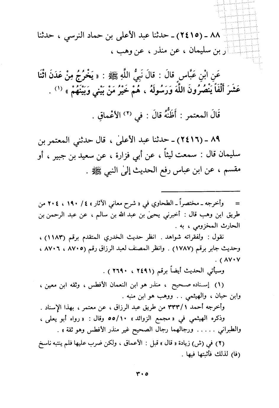 2415 - حَدَّثَنَا عَبْدُ الْأَعْلَى بْنُ حَمَّادٍ النَّرْسِيُّ، حَدَّثَنَا مُعْتَمِرُ بْنُ سُلَيْمَانَ، عَنْ مُنْذِرٍ، عَنْ وَهْبٍ، عَنِ ابْنِ عَبَّاسٍ قَالَ: قَالَ نَبِيُّ اللَّهِ صَلَّى اللهُ عَلَيْهِ وَسَلَّمَ: «§يَخْرُجُ مِنْ عَدَنَ اثْنَا عَشَرَ أَلْفًا يَنْصُرُونَ اللَّهَ وَرَسُولَهُ، هُمْ خَيْرُ مَنْ بَيْنِي وَبَيْنَهُمْ» قَالَ الْمُعْتَمِرُ: أَظُنُّهُ قَالَ: فِي الْأَعْمَاقِKإسناده صحيح