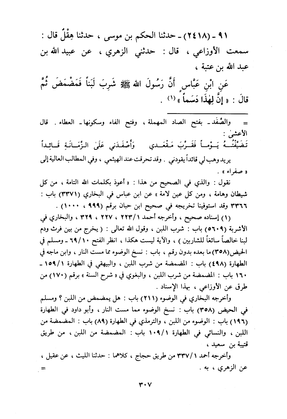 2418 - حَدَّثَنَا الْحَكَمُ بْنُ مُوسَى، حَدَّثَنَا هِقْلٌ قَالَ: سَمِعْتُ الْأَوْزَاعِيَّ قَالَ: حَدَّثَنِي الزُّهْرِيُّ، عَنْ عُبَيْدِ اللَّهِ بْنِ عَبْدِ اللَّهِ بْنِ عُتْبَةَ، عَنِ ابْنِ عَبَّاسٍ أَنَّ رَسُولَ اللَّهِ صَلَّى اللهُ عَلَيْهِ وَسَلَّمَ " §شَرِبَ لَبَنًا فَمَضْمَضَ ثُمَّ قَالَ: «إِنَّ لِهَذَا دَسَمًا» Kإسناده صحيح