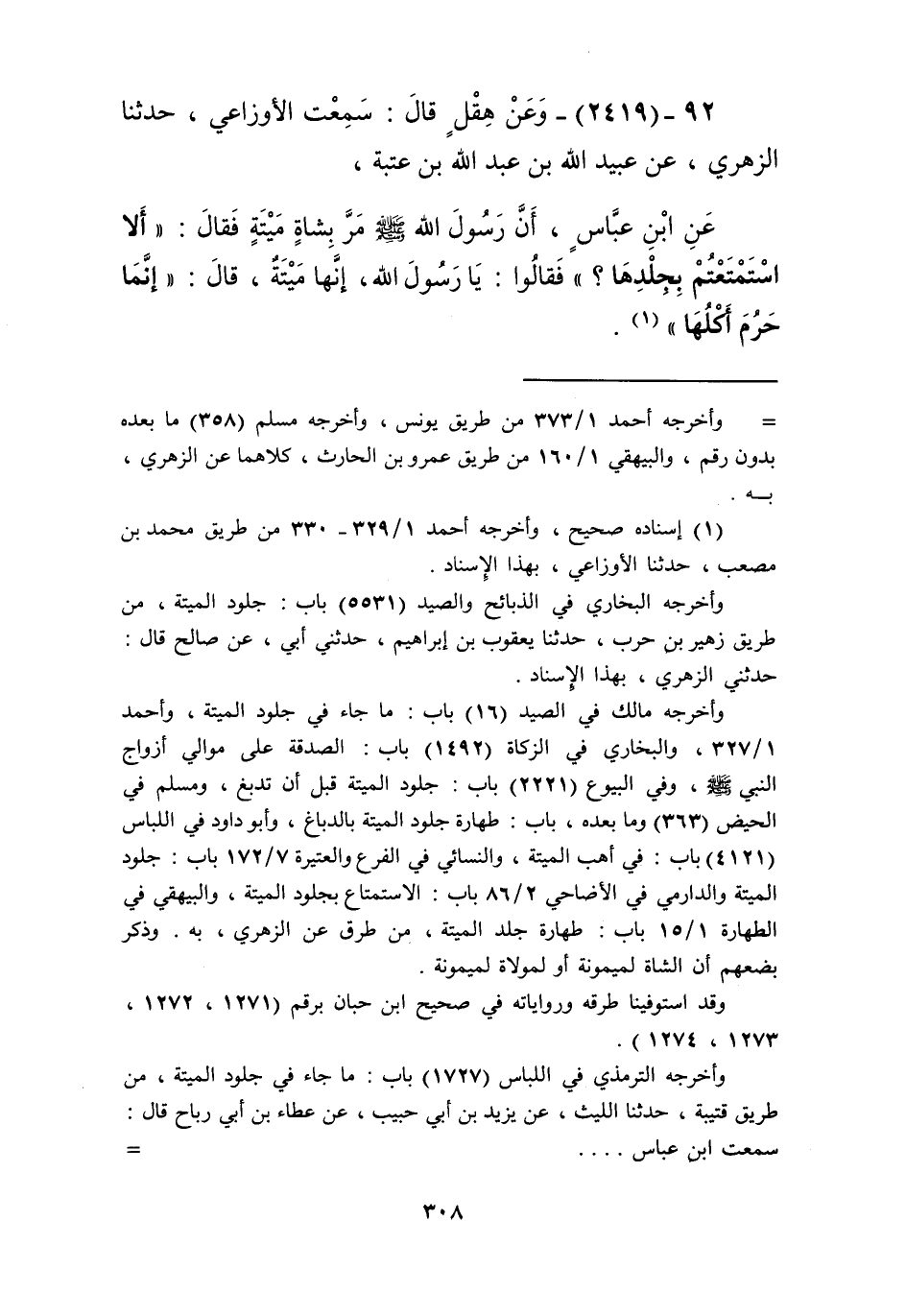 2419 - وَعَنْ هِقْلٍ قَالَ: سَمِعْتُ الْأَوْزَاعِيَّ، حَدَّثَنَا الزُّهْرِيُّ، عَنْ عُبَيْدِ اللَّهِ بْنِ عَبْدِ اللَّهِ بْنِ عُتْبَةَ، عَنِ ابْنِ عَبَّاسٍ أَنَّ رَسُولَ اللَّهِ صَلَّى اللهُ عَلَيْهِ وَسَلَّمَ مَرَّ بِشَاةٍ مَيْتَةٍ فَقَالَ: «§أَلَا اسْتَمْتَعْتُمْ بِجِلْدِهَا؟» فَقَالُوا: يَا رَسُولَ اللَّهِ إِنَّهَا مَيْتَةٌ. قَالَ: «إِنَّمَا حَرُمَ أَكْلُهَا» Kإسناده صحيح