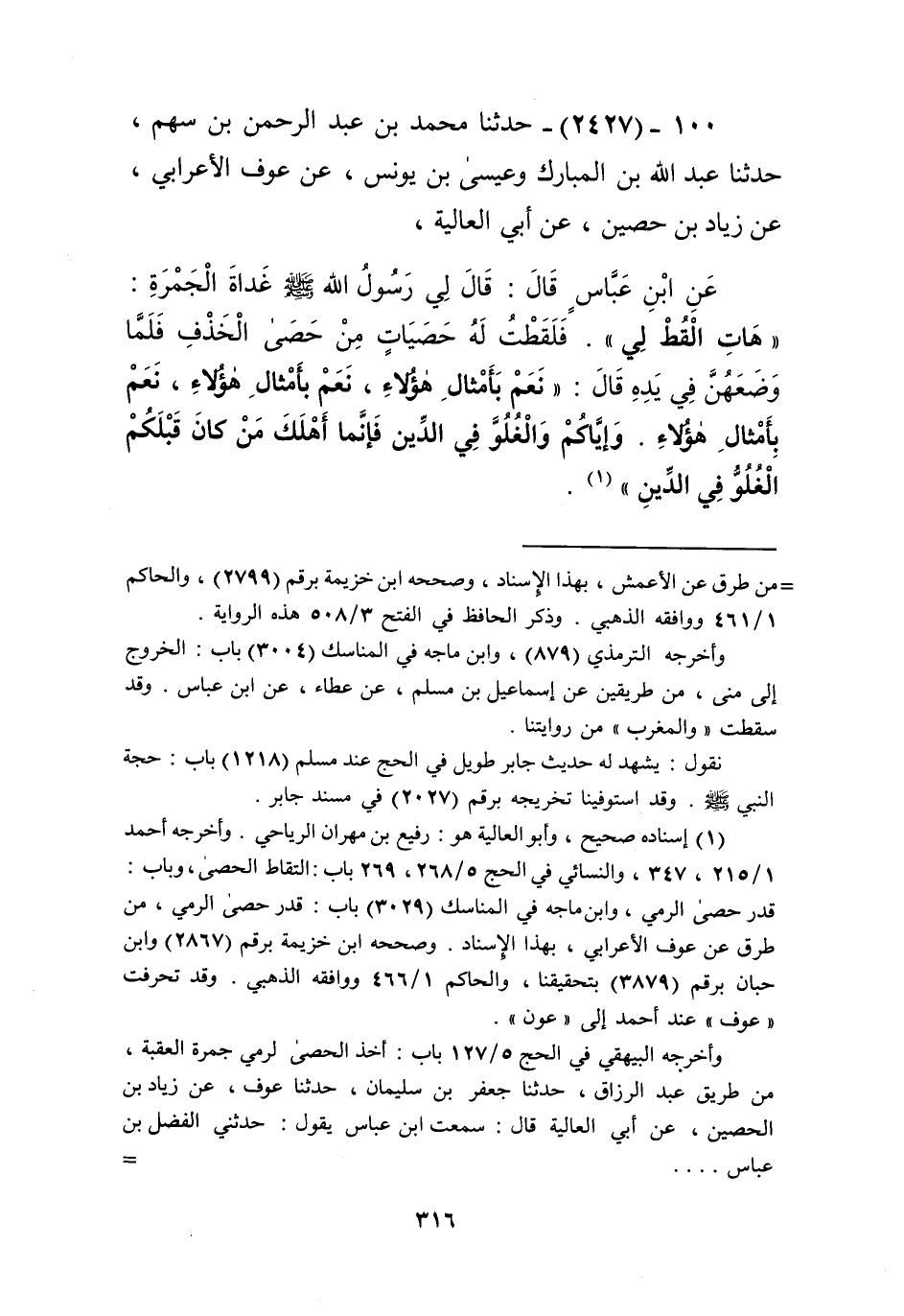 2427 - حَدَّثَنَا مُحَمَّدُ بْنُ عَبْدِ الرَّحْمَنِ بْنِ سَهْمٍ، حَدَّثَنَا عَبْدُ اللَّهِ بْنُ الْمُبَارَكِ، وَعِيسَى بْنُ يُونُسَ، عَنْ عَوْفٍ الْأَعْرَابِيِّ، عَنْ زِيَادِ بْنِ حُصَيْنٍ، عَنْ أَبِي الْعَالِيَةِ، عَنِ ابْنِ عَبَّاسٍ قَالَ: قَالَ لِي رَسُولُ اللَّهِ صَلَّى اللهُ عَلَيْهِ وَسَلَّمَ غَدَاةَ الْجَمْرَةِ: «§هَاتِ الْقُطْ لِي». فَلَقَطْتُ لَهُ حَصَيَاتٍ مِنْ حَصَى الْخَذْفِ فَلَمَّا وَضَعَهُنَّ فِي يَدِهِ قَالَ: «نَعَمْ بِأَمْثَالِ هَؤُلَاءِ. نَعَمْ بِأَمْثَالِ هَؤُلَاءِ. نَعَمْ بِأَمْثَالِ هَؤُلَاءِ. وَإِيَّاكُمْ وَالْغُلُوَّ فِي الدِّينِ؛ فَإِنَّمَا أَهْلَكَ مَنْ كَانَ قَبْلَكُمُ الْغُلُوُّ فِي الدِّينِ» Kإسناده صحيح