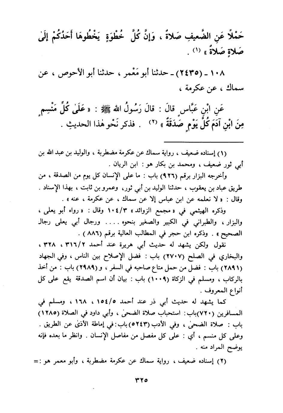 2435 - حَدَّثَنَا أَبُو مَعْمَرٍ، حَدَّثَنَا أَبُو الْأَحْوَصِ، عَنْ سِمَاكٍ، عَنْ عِكْرِمَةَ، عَنِ ابْنِ عَبَّاسٍ قَالَ: قَالَ رَسُولُ اللَّهِ صَلَّى اللهُ عَلَيْهِ وَسَلَّمَ: «§عَلَى كُلِّ مَنْسِمٍ مِنِ ابْنِ آدَمَ كُلَّ يَوْمٍ صَدَقَةٌ» فَذَكَرَ نَحْوَ هَذَا الْحَدِيثِKإسناده ضعيف