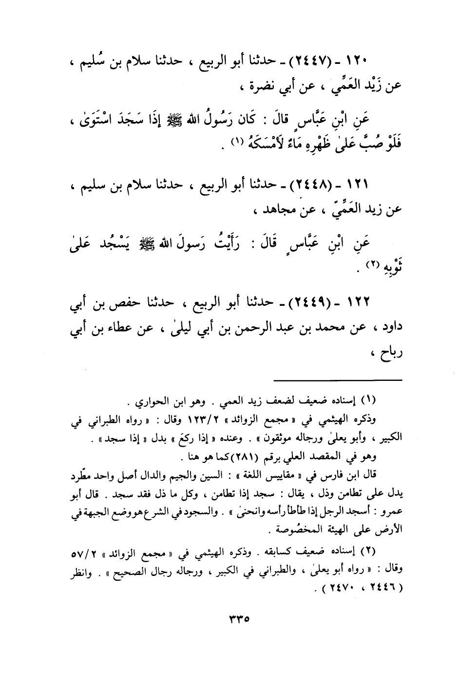 2448 - حَدَّثَنَا أَبُو الرَّبِيعِ، حَدَّثَنَا سَلَّامُ بْنُ سُلَيْمٍ، عَنْ زَيْدٍ الْعَمِّيِّ، عَنْ مُجَاهِدٍ، عَنِ ابْنِ عَبَّاسٍ قَالَ: «§رَأَيْتُ رَسُولَ اللَّهِ صَلَّى اللهُ عَلَيْهِ وَسَلَّمَ يَسْجُدُ عَلَى ثَوْبِهِ» Kإسناده ضعيف