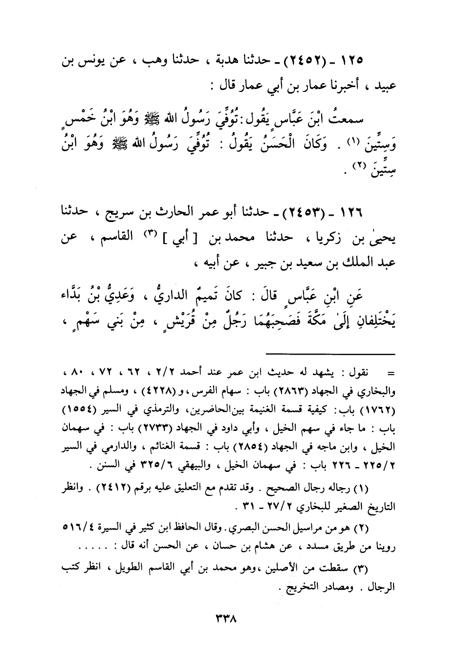 2452 - حَدَّثَنَا هُدْبَةُ، حَدَّثَنَا وَهْبٌ، عَنْ يُونُسَ بْنِ عُبَيْدٍ، أَخْبَرَنَا عَمَّارُ بْنُ أَبِي عَمَّارٍ قَالَ: سَمِعْتُ ابْنَ عَبَّاسٍ يَقُولُ: «§تُوُفِّيَ رَسُولُ اللَّهِ صَلَّى اللهُ عَلَيْهِ وَسَلَّمَ وَهُوَ ابْنُ خَمْسٍ وَسِتِّينَ». وَكَانَ الْحَسَنُ يَقُولُ: «تُوُفِّيَ رَسُولُ اللَّهِ صَلَّى اللهُ عَلَيْهِ وَسَلَّمَ وَهُوَ ابْنُ سِتِّينَ» Kرجاله رجال الصحيح