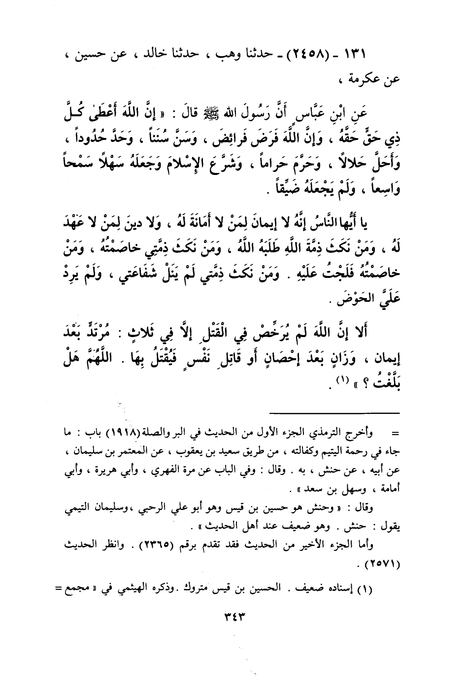 2458 - حَدَّثَنَا وَهْبٌ، حَدَّثَنَا خَالِدٌ، عَنْ حُسَيْنٍ، عَنْ عِكْرِمَةَ، عَنِ ابْنِ عَبَّاسٍ أَنَّ رَسُولَ اللَّهِ صَلَّى اللهُ عَلَيْهِ وَسَلَّمَ قَالَ: §إِنَّ اللَّهَ أَعْطَى كُلَّ ذِي حَقٍّ حَقَّهُ، وَإِنَّ اللَّهَ فَرَضَ فَرَائِضَ وَسَنَّ سُنَنًا، وَحَّدَ حُدُودًا، وَأَحَلَّ حَلَالًا، وَحَرَّمَ حَرَامًا، وَشَرَعَ الْإِسْلَامَ، وَجَعَلَهُ سَهْلًا سَمْحًا وَاسِعًا، وَلَمْ يَجْعَلْهُ ضَيِّقًا. " يَا أَيُّهَا النَّاسُ إِنَّهُ لَا إِيمَانَ لِمَنْ لَا أَمَانَةَ لَهُ، وَلَا دِينَ لِمَنْ لَا عَهْدَ لَهُ، وَمَنْ نَكَثَ ذِمَّةَ اللَّهِ طَلَبَهُ اللَّهُ، وَمَنْ نَكَثَ ذِمَّتِي خَاصَمْتُهُ وَمَنْ خَاصَمْتُهُ فَلَجْتُ عَلَيْهِ، وَمَنْ نَكَثَ ذِمَّتِي لَمْ يَنَلْ شَفَاعَتِي وَلَمْ يَرِدْ عَلَى الْحَوْضِ. أَلَا إِنَّ اللَّهَ لَمْ يُرَخِّصْ فِي الْقَتْلِ إِلَّا فِي ثَلَاثٍ: مُرْتَدٌ بَعْدَ إِيمَانٍ، وَزَّانٍ بَعْدَ إِحْصَانٍ، أَوْ قَاتَلِ نَفْسٍ فَيُقْتَلُ بِهَا. اللَّهُمَّ هَلْ بَلَّغْتُ؟ "Kإسناده ضعيف