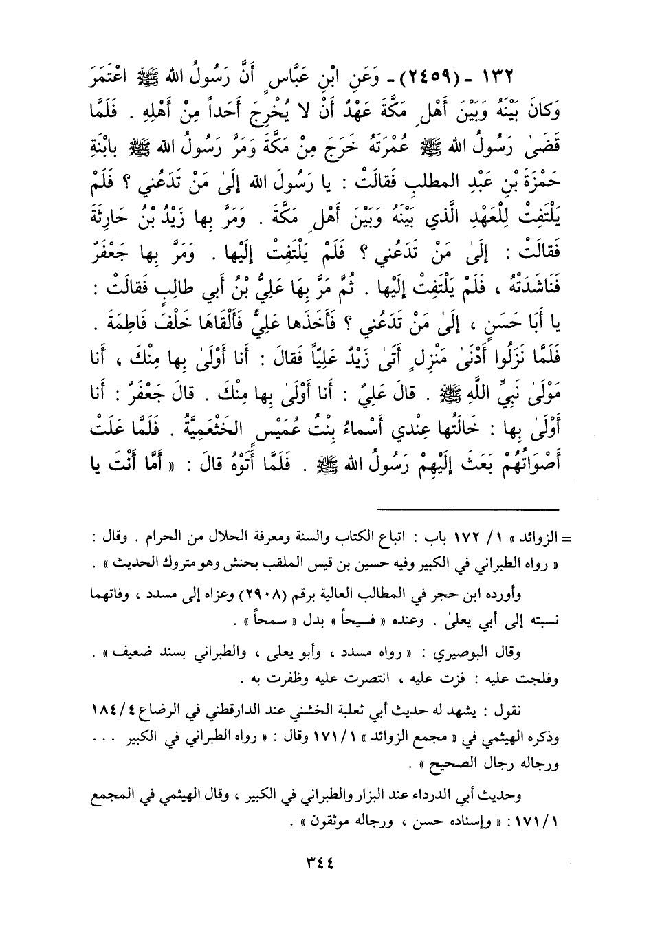 2459 - وَعَنِ ابْنِ عَبَّاسٍ، أَنَّ رَسُولَ اللَّهِ صَلَّى اللهُ عَلَيْهِ وَسَلَّمَ اعْتَمَرَ وَكَانَ بَيْنَهُ وَبَيْنَ أَهْلِ مَكَّةَ عَهْدٌ أَنْ لَا يُخْرِجَ أَحَدًا مِنْ أَهْلِهِ. فَلَمَّا قَضَى رَسُولُ اللَّهِ صَلَّى اللهُ عَلَيْهِ وَسَلَّمَ عُمْرَتَهُ خَرَجَ مِنْ مَكَّةَ وَمَرَّ رَسُولُ اللَّهِ صَلَّى اللهُ عَلَيْهِ وَسَلَّمَ بِابْنَةِ حَمْزَةَ بْنِ عَبْدِ الْمُطَّلِبِ فَقَالَتْ: يَا رَسُولَ اللَّهِ إِلَى مَنْ تَدَعُنِي؟ فَلَمْ يَلْتَفِتْ لِلْعَهْدِ الَّذِي بَيْنَهُ وَبَيْنَ أَهْلِ مَكَّةَ. وَمَرَّ بِهَا زَيْدُ بْنُ حَارِثَةَ فَقَالَتْ: إِلَى مَنْ تَدَعُنِي؟ فَلَمْ يَلْتَفِتْ إِلَيْهَا. وَمَرَّ بِهَا جَعْفَرٌ فَنَاشَدْتُهُ فَلَمْ يَلْتَفِتْ إِلَيْهَا، ثُمَّ مَرَّ بِهَا عَلِيُّ بْنُ أَبِي طَالِبٍ فَقَالَتْ: يَا أَبَا حَسَنٍ إِلَى مَنْ تَدَعُنِي؟ فَأَخَذَهَا عَلِيٌّ فَأَلْقَاهَا خَلْفَ فَاطِمَةَ. فَلَمَّا نَزَلُوا أَدْنَى مَنْزِلٍ أَتَى زَيْدٌ عَلِيًّا فَقَالَ: أَنَا أَوْلَى بِهَا مِنْكَ أَنَا مَوْلَى نَبِيِّ اللَّهِ صَلَّى اللهُ عَلَيْهِ وَسَلَّمَ. قَالَ عَلِيٌّ: أَنَا أَوْلَى بِهَا مِنْكَ. قَالَ جَعْفَرٌ: أَنَا أَوْلَى بِهَا خَالَتُهَا عِنْدِي أَسْمَاءُ بِنْتُ عُمَيْسٍ الْخَثْعَمِيَّةُ. فَلَمَّا عَلَتْ أَصْوَاتُهُمْ بَعَثَ إِلَيْهِمْ رَسُولُ اللَّهِ صَلَّى اللهُ عَلَيْهِ وَسَلَّمَ فَلَمَّا أَتَوْهُ قَالَ: «§أَمَّا أَنْتَ يَا جَعْفَرُ فَأَنْتَ تُشْبِهُ خَلْقِي وَخُلُقِي، وَأَمَّا أَنْتَ يَا عَلِيُّ، فَأَنَا مِنْكَ وَأَنْتَ وَصِيِّي، وَأَمَّا زَيْدٌ فَمَوْلَايَ وَمَوْلَاكُمْ، فَادْفَعِ الْجَارِيَةَ إِلَى خَالَتِهَا وَهِيَ أَوْلَى بِهَا» Kإسناده ضعيف