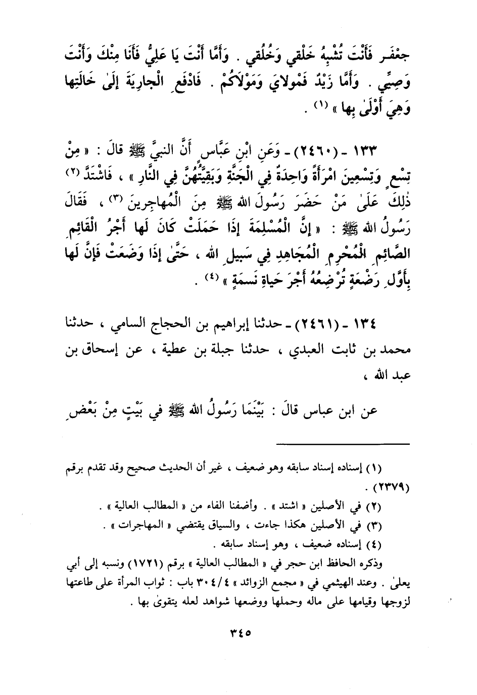 2460 - وَعَنِ ابْنِ عَبَّاسٍ أَنَّ النَّبِيَّ صَلَّى اللهُ عَلَيْهِ وَسَلَّمَ قَالَ: «§مِنْ تِسْعٍ وَتِسْعِينَ امْرَأَةً وَاحِدَةٌ فِي الْجَنَّةِ وَبَقِيَّتُهُنَّ فِي النَّارِ». فَاشْتَدَّ ذَلِكَ عَلَى مَنْ حَضَرَ رَسُولَ اللَّهِ صَلَّى اللهُ عَلَيْهِ وَسَلَّمَ مِنَ الْمُهَاجِرِينَ فَقَالَ رَسُولُ اللَّهِ صَلَّى اللهُ عَلَيْهِ وَسَلَّمَ: «إِنَّ الْمُسْلِمَةَ إِذَا حَمَلَتْ كَانَ لَهَا أَجْرُ الْقَائِمِ الصَّائِمِ الْمُحْرِمِ الْمُجَاهِدِ فِي سَبِيلِ اللَّهِ حَتَّى إِذَا وَضَعَتْ فَإِنَّ لَهَا بِأَوَّلِ رَضْعَةٍ تُرْضِعُهُ أَجْرَ حَيَاةِ نَسَمَةٍ» Kإسناده ضعيف