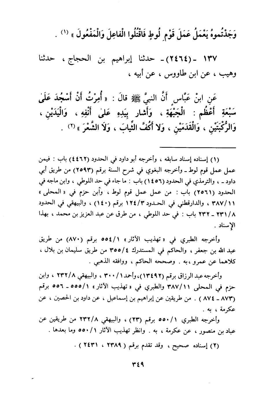 2464 - حَدَّثَنَا إِبْرَاهِيمُ بْنُ الْحَجَّاجِ، حَدَّثَنَا وُهَيْبٌ، عَنِ ابْنِ طَاوُوسٍ، عَنْ أَبِيهِ، عَنِ ابْنِ عَبَّاسٍ أَنَّ النَّبِيَّ صَلَّى اللهُ عَلَيْهِ وَسَلَّمَ قَالَ: " §أُمِرْتُ أَنْ أَسْجُدَ عَلَى سَبْعَةِ أَعْظُمٍ: الْجَبْهَةِ وَأَشَارَ بِيَدِهِ عَلَى أَنْفِهِ وَالْيَدَيْنِ وَالرُّكْبَتَيْنِ وَالْقَدَمَيْنِ، وَلَا أَكُفَّ الثِّيَابَ وَلَا الشَّعْرِ "Kإسناده صحيح