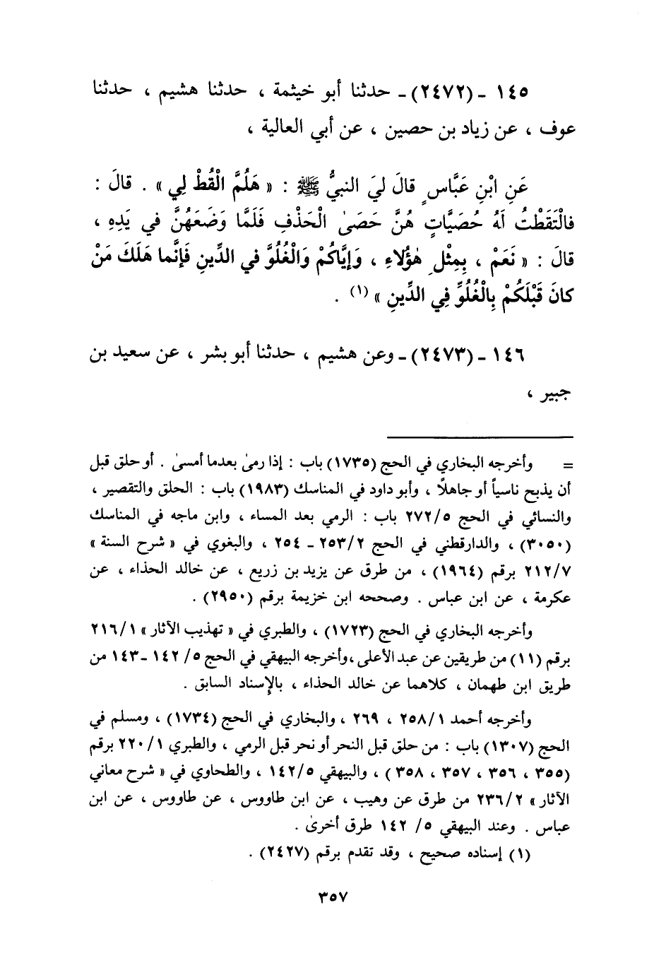 2472 - حَدَّثَنَا أَبُو خَيْثَمَةَ، حَدَّثَنَا هُشَيْمٌ، حَدَّثَنَا عَوْفٌ، عَنْ زِيَادِ بْنِ حُصَيْنٍ، عَنْ أَبِي الْعَالِيَةِ، عَنِ ابْنِ عَبَّاسٍ قَالَ لِيَ النَّبِيُّ صَلَّى اللهُ عَلَيْهِ وَسَلَّمَ: «§هَلُمَّ الْقُطْ لِي». قَالَ: فَالْتَقَطْتُ لَهُ حَصَيَاتٍ هُنَّ حَصَى الْخَذْفِ فَلَمَّا وَضَعَهُنَّ فِي يَدِهِ. قَالَ: «نَعَمْ بِمِثْلِ هَؤُلَاءِ، وَإِيَّاكُمْ وَالْغُلُوَّ فِي الدِّينِ؛ فَإِنَّمَا هَلَكَ مَنْ كَانَ قَبْلَكُمْ بِالْغُلُوِّ فِي الدِّينِ» Kإسناده صحيح