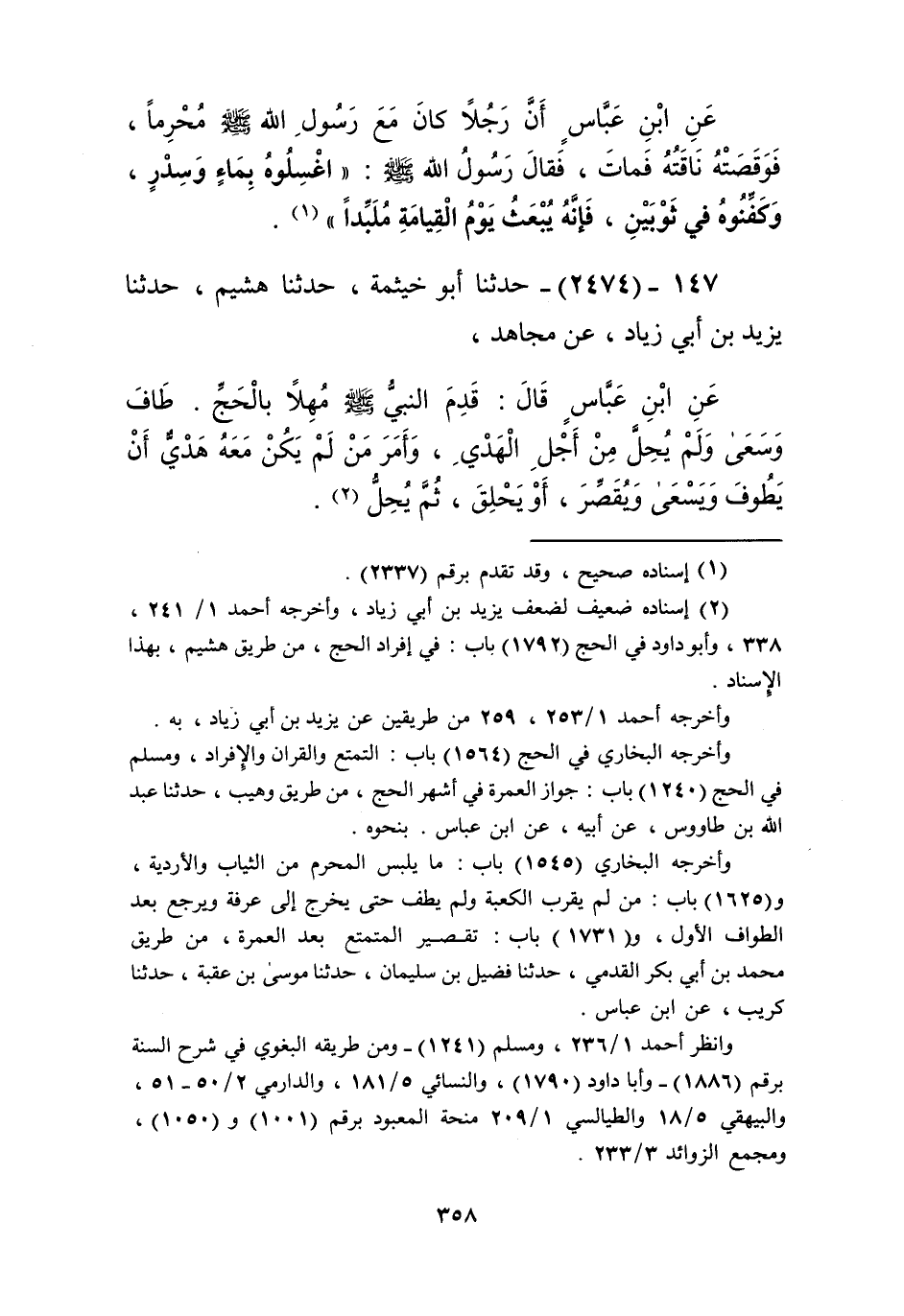 2474 - حَدَّثَنَا أَبُو خَيْثَمَةَ، حَدَّثَنَا هُشَيْمٌ، حَدَّثَنَا يَزِيدُ بْنُ أَبِي زِيَادٍ، عَنْ مُجَاهِدٍ، عَنِ ابْنِ عَبَّاسٍ قَالَ: قَدِمَ النَّبِيُّ صَلَّى اللهُ عَلَيْهِ وَسَلَّمَ مُهِلًّا بِالْحَجِّ. طَافَ وَسَعَى وَلَمْ يَحِلَّ مِنْ أَجْلِ الْهَدْيِ «§وَأَمَرَ مَنْ لَمْ يَكُنْ مَعَهُ هَدْيٌ أَنْ يَطُوفَ وَيَسْعَى وَيُقَصِّرَ أَوْ يَحْلِقَ، ثُمَّ يَحِلُّ» Kإسناده ضعيف