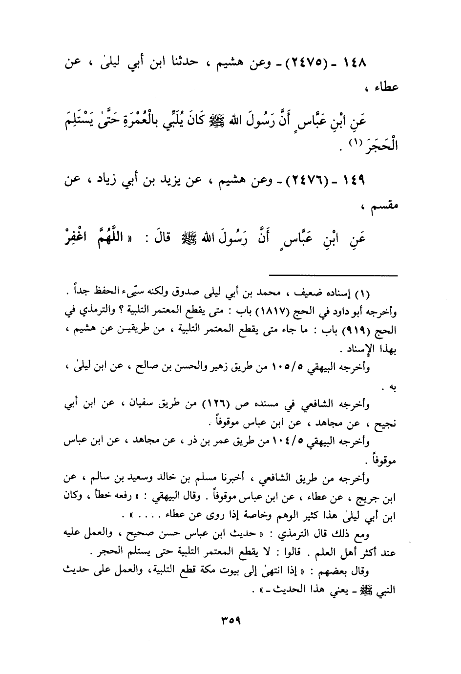 2475 - وَعَنْ هُشَيْمٍ، حَدَّثَنَا ابْنُ أَبِي لَيْلَى، عَنْ عَطَاءٍ، عَنِ ابْنِ عَبَّاسٍ أَنَّ رَسُولَ اللَّهِ صَلَّى اللهُ عَلَيْهِ وَسَلَّمَ «§كَانَ يُلَبِّي بِالْعُمْرَةِ حَتَّى يَسْتَلِمَ الْحَجَرَ» Kإسناده ضعيف