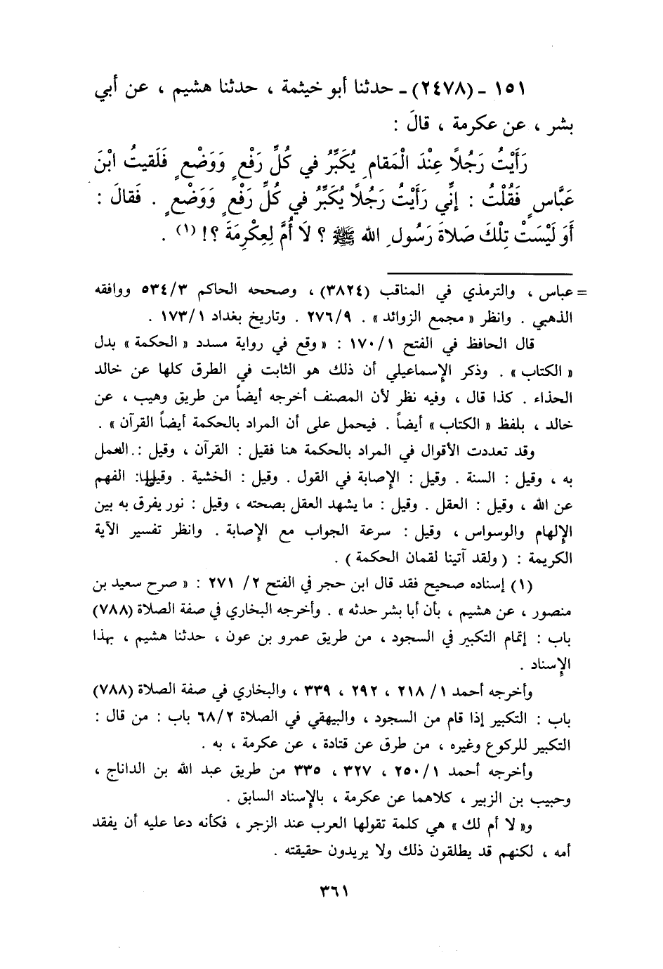 2478 - حَدَّثَنَا أَبُو خَيْثَمَةَ، حَدَّثَنَا هُشَيْمٌ، عَنْ أَبِي بِشْرٍ، عَنْ عِكْرِمَةَ قَالَ: رَأَيْتُ رَجُلًا عِنْدَ الْمَقَامِ يُكَبِّرُ فِي كُلِّ رَفْعٍ وَوَضْعٍ. فَلَقِيتُ ابْنَ عَبَّاسٍ فَقُلْتُ: " §إِنِّي رَأَيْتُ رَجُلًا يُكَبِّرُ فِي كُلِّ رَفْعٍ وَوَضْعٍ. فَقَالَ: أَوَلَيْسَتْ تِلْكَ صَلَاةَ رَسُولِ اللَّهِ صَلَّى اللهُ عَلَيْهِ وَسَلَّمَ؟ لَا أُمَّ لِعِكْرِمَةَ؟ "Kإسناده صحيح