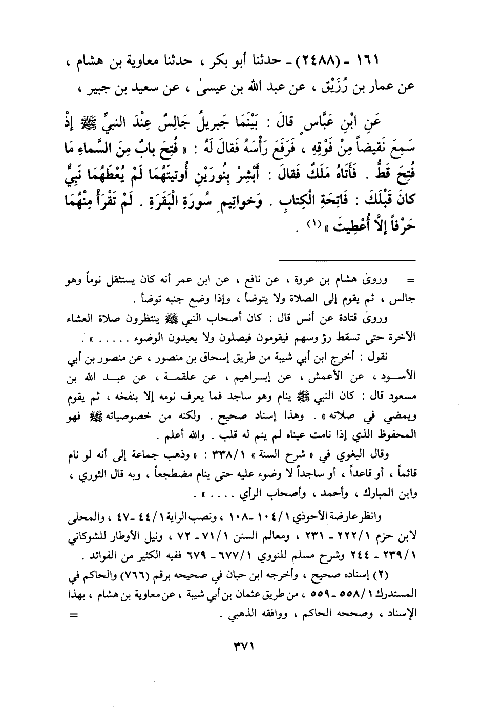 2488 - حَدَّثَنَا أَبُو بَكْرٍ، حَدَّثَنَا مُعَاوِيَةُ بْنُ هِشَامٍ، عَنْ عَمَّارِ بْنِ رُزَيْقٍ، عَنْ عَبْدِ اللَّهِ بْنِ عِيسَى، عَنْ سَعِيدِ بْنِ جُبَيْرٍ، عَنِ ابْنِ عَبَّاسٍ قَالَ: بَيْنَمَا جِبْرِيلُ جَالِسٌ عِنْدَ النَّبِيِّ صَلَّى اللهُ عَلَيْهِ وَسَلَّمَ إِذْ سَمِعَ نَقِيضًا مِنْ فَوْقِهِ فَرَفَعَ رَأْسَهُ فَقَالَ لَهُ: " §فُتِحَ بَابٌ مِنَ السَّمَاءِ مَا فُتِحَ قَطُّ. فَأَتَاهُ مَلَكٌ فَقَالَ: أَبْشِرْ بِنُورَيْنِ أُوتِيتَهُمَا لَمْ يُعْطَهُمَا نَبِيٌّ كَانَ قَبْلَكَ: فَاتِحَةِ الْكِتَابِ، وَخَوَاتِيمِ سُورَةِ الْبَقَرَةِ. لَمْ تَقْرَأْ مِنْهُمَا حَرْفًا إِلَّا أُعْطِيتَ "Kإسناده صحيح